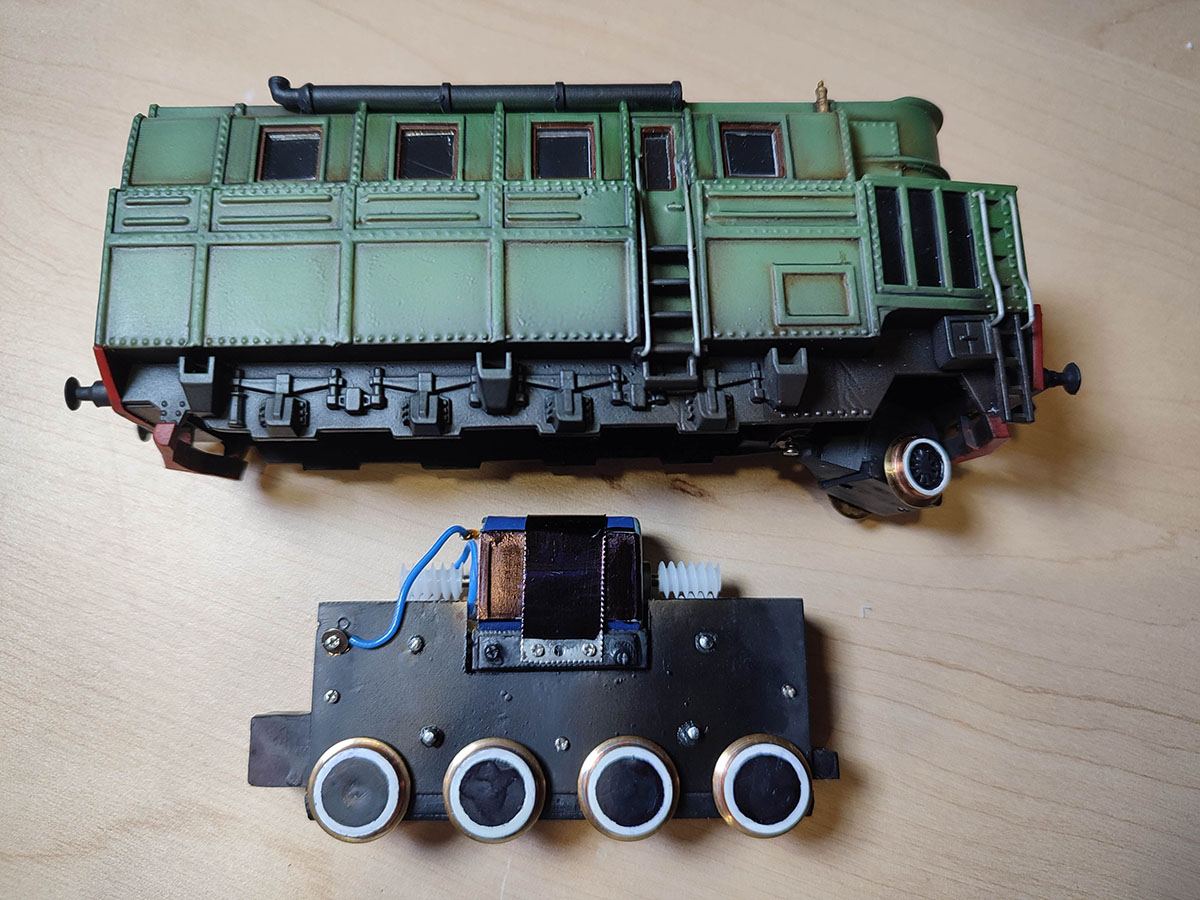 да, трьохосевая ходовая была старого образца и я решил сделать новую четырехосевую на текущем уровне. Она намного тише, и привод на все оси. Та и двигатели давно валялся, который хотелось приспособить. Один пойдет в ВЛ-19, а второй сюда всунул