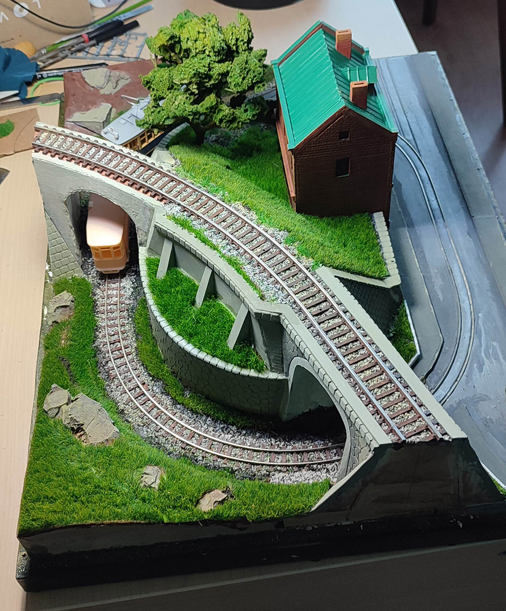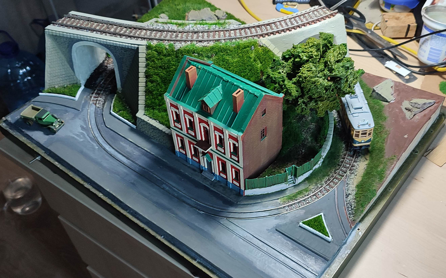 решил больше не тянуть и плотно начать делать микромакет на стол. Пока еще работы очень много, но в общих чертах вырисовывается. Для езды запланирован мой старий Х с прицепным вагоном или грузовой Х (у него ходовая пошустрее и намного менее шумная), в перспективе запланирован свет на макете и в грузовом трамвае. Трава сделана из китайского травяного коврика. Если выщипать клочки (я ножницами по металлу) и подкрасить в более реалистичный цвет из аерографа, то на удивление реалистичную высокую траву можно сделать