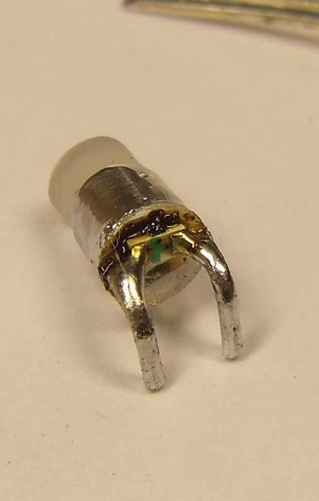 вот так выглядит... классический по параметрам светодиод диаметром 3 мм, с плоской линзой 8-) .