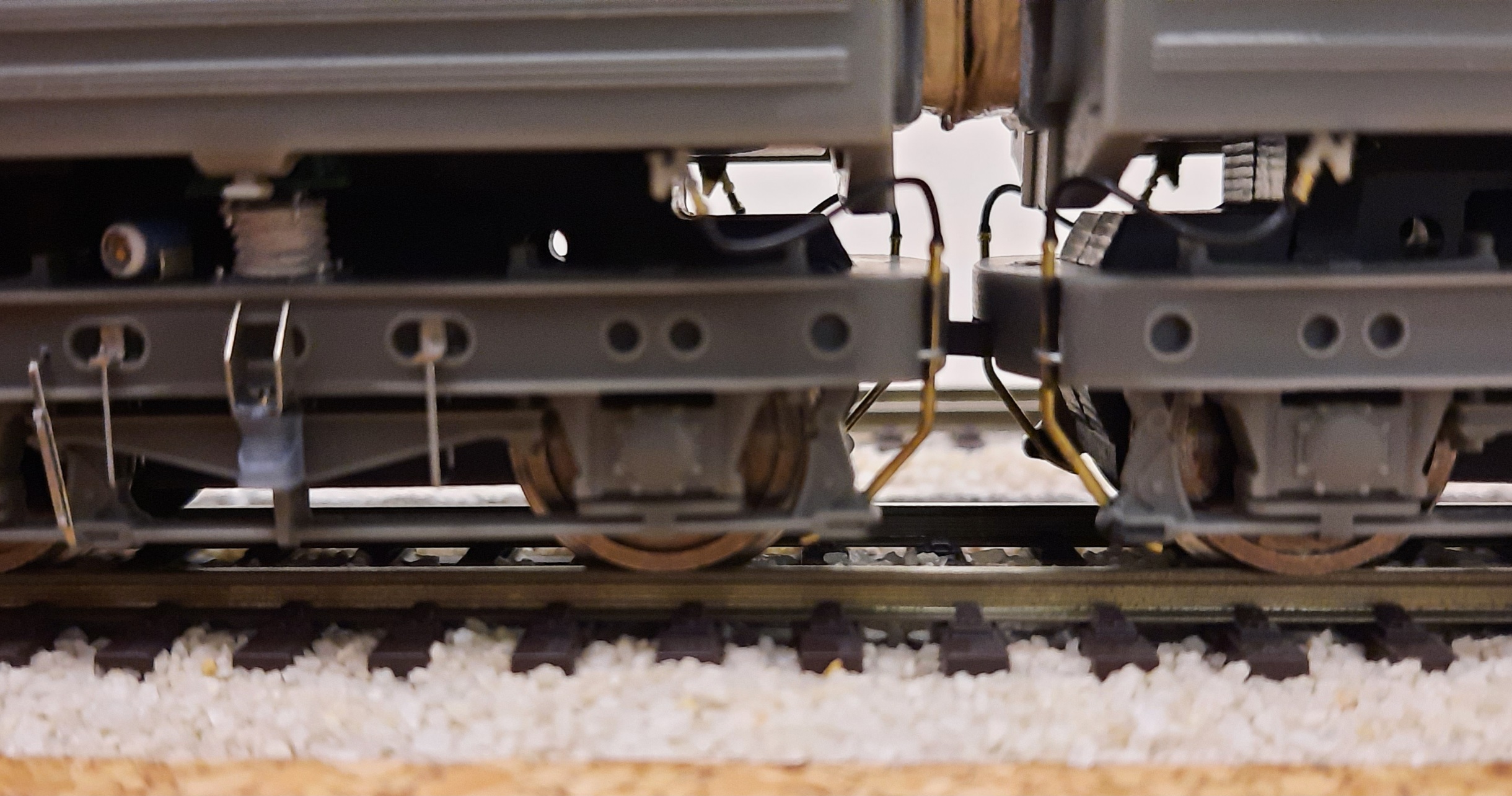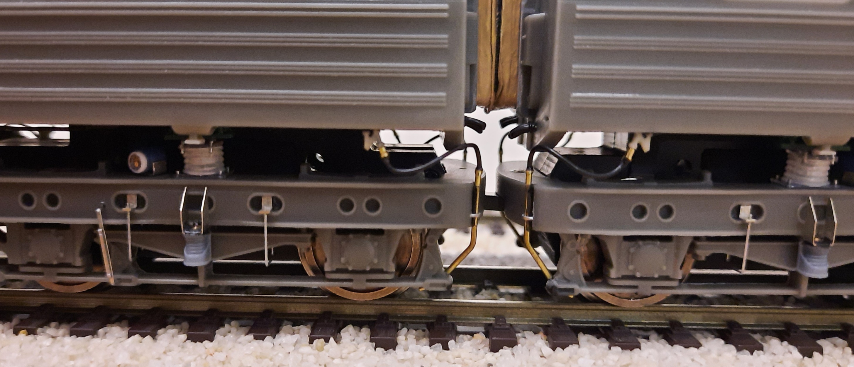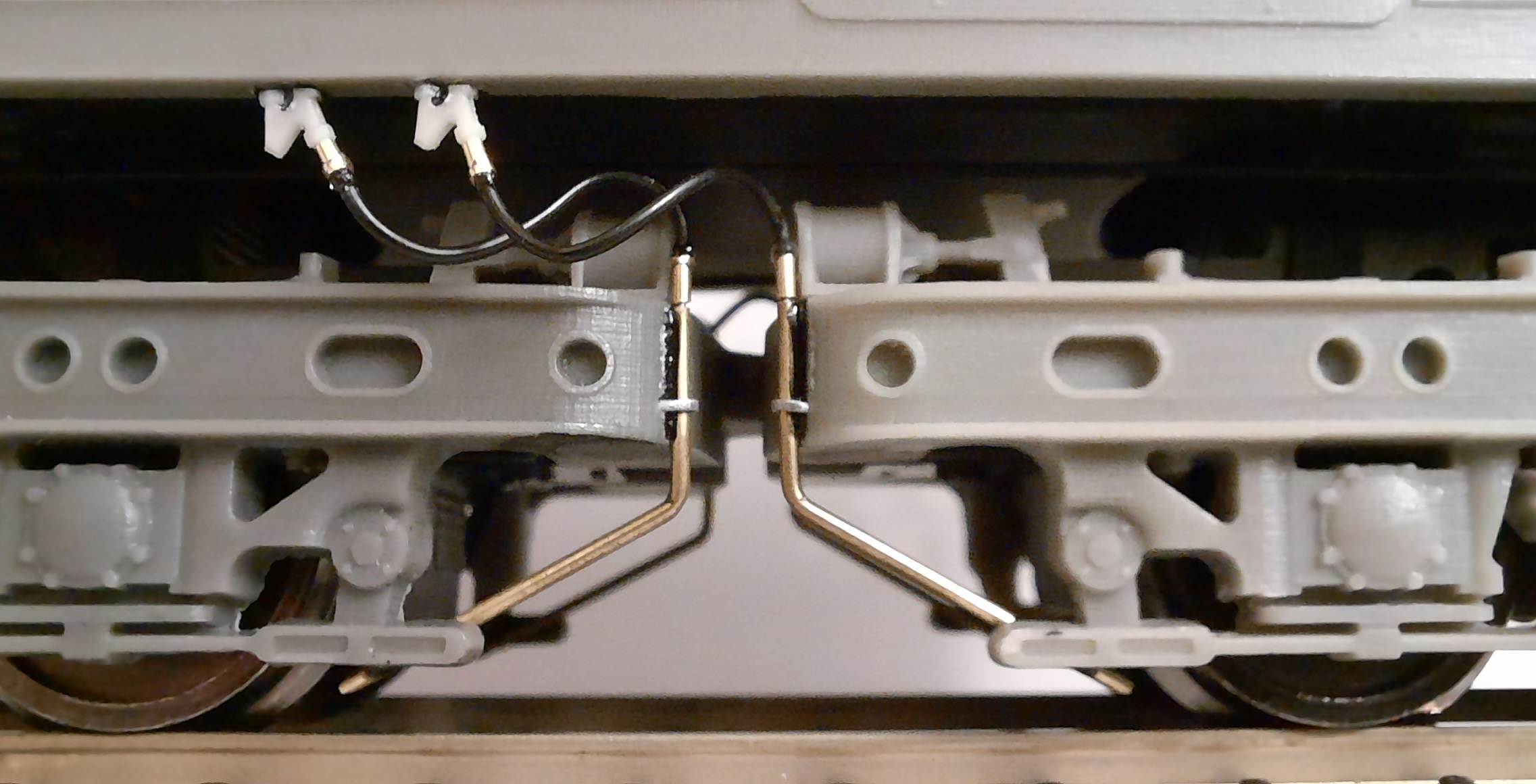 Додав спрощені імітації кабельних з'єднань між секціями. Модель ходова, тому шланги "розірвані" для швидкої постановки на рейки і простого зчеплення секцій. Бо якщо буду робити гнучкі нерозривні кабелі, вже перехочеться катати, поки все з'єднаєш...