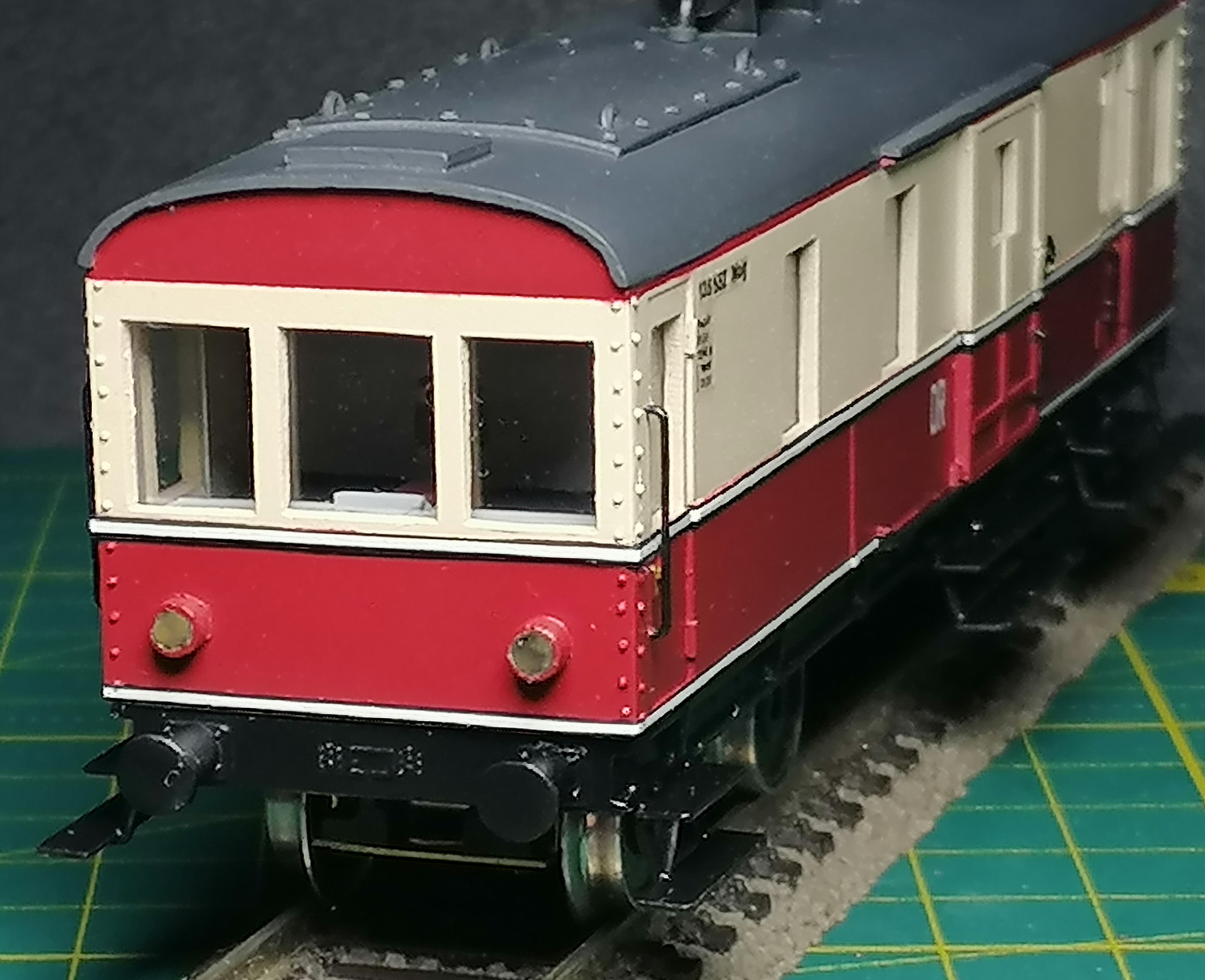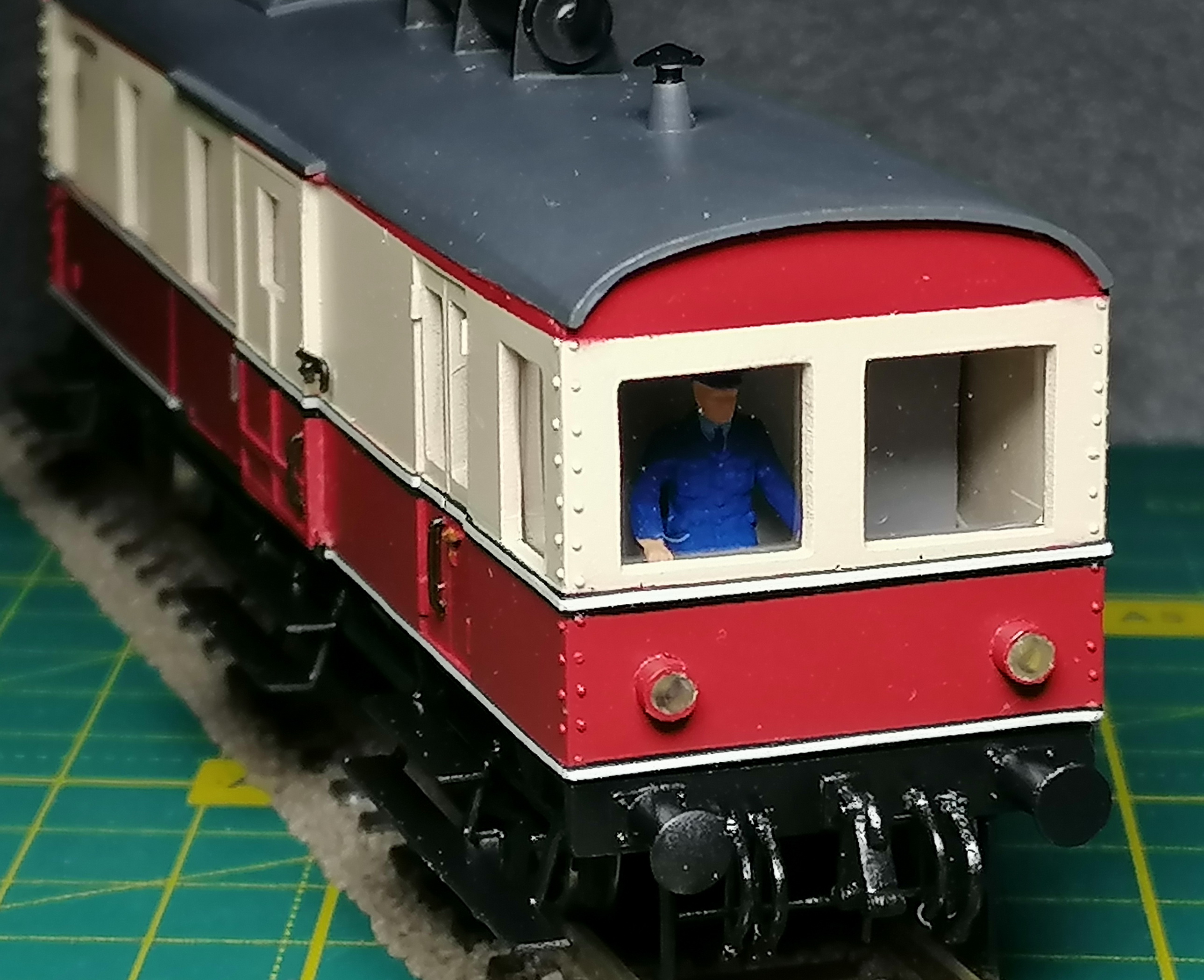 Вклеил стекла и кабины. В переднюю посадил машиниста. Спаял обратно провода между рамой и корпусом. Выглядит уже почти закончено. Самое главное - нет боковин тележки. Руки ещё не дошли до неё. Пока стоит на полке в таком виде. Далі буде.