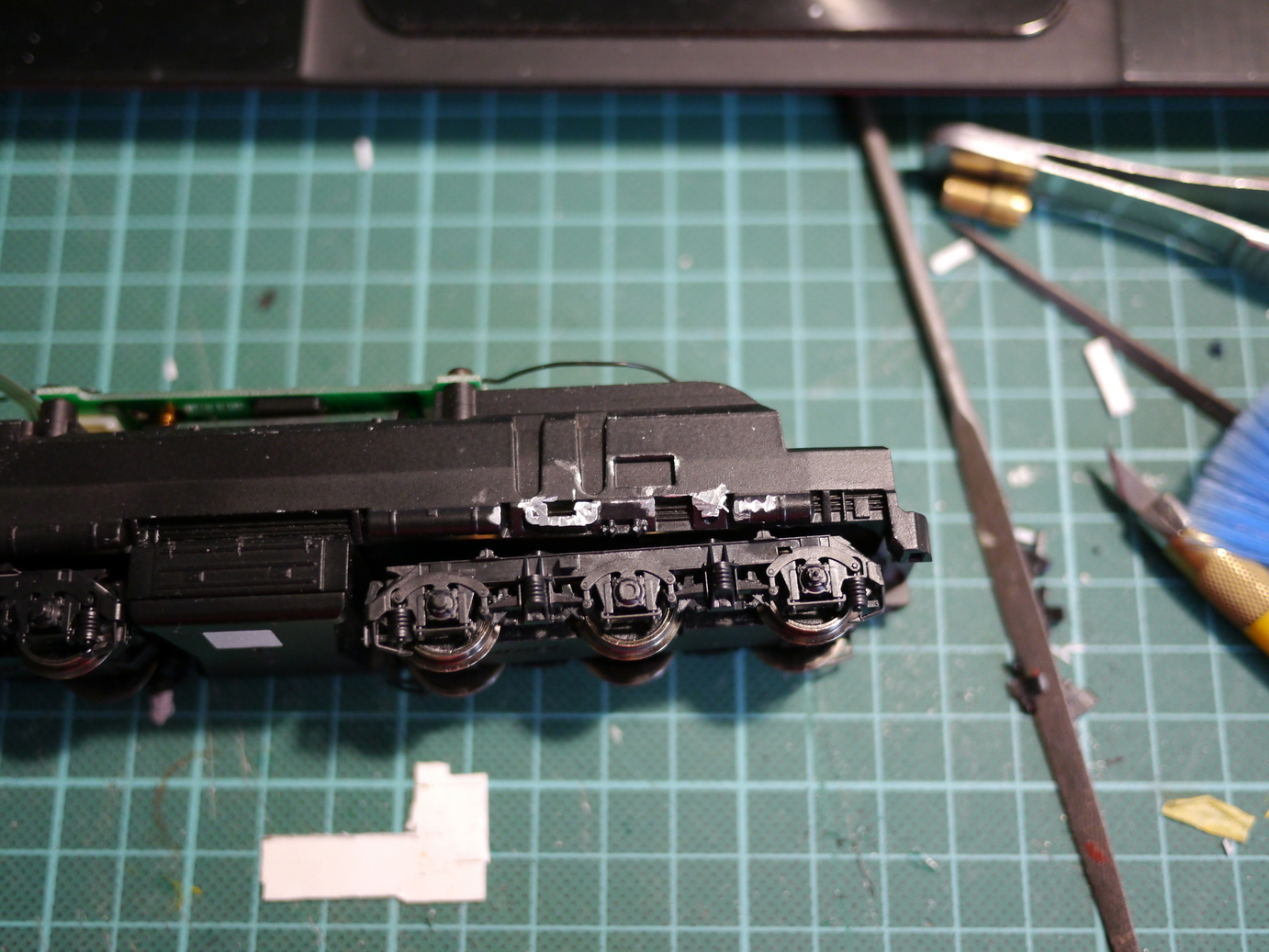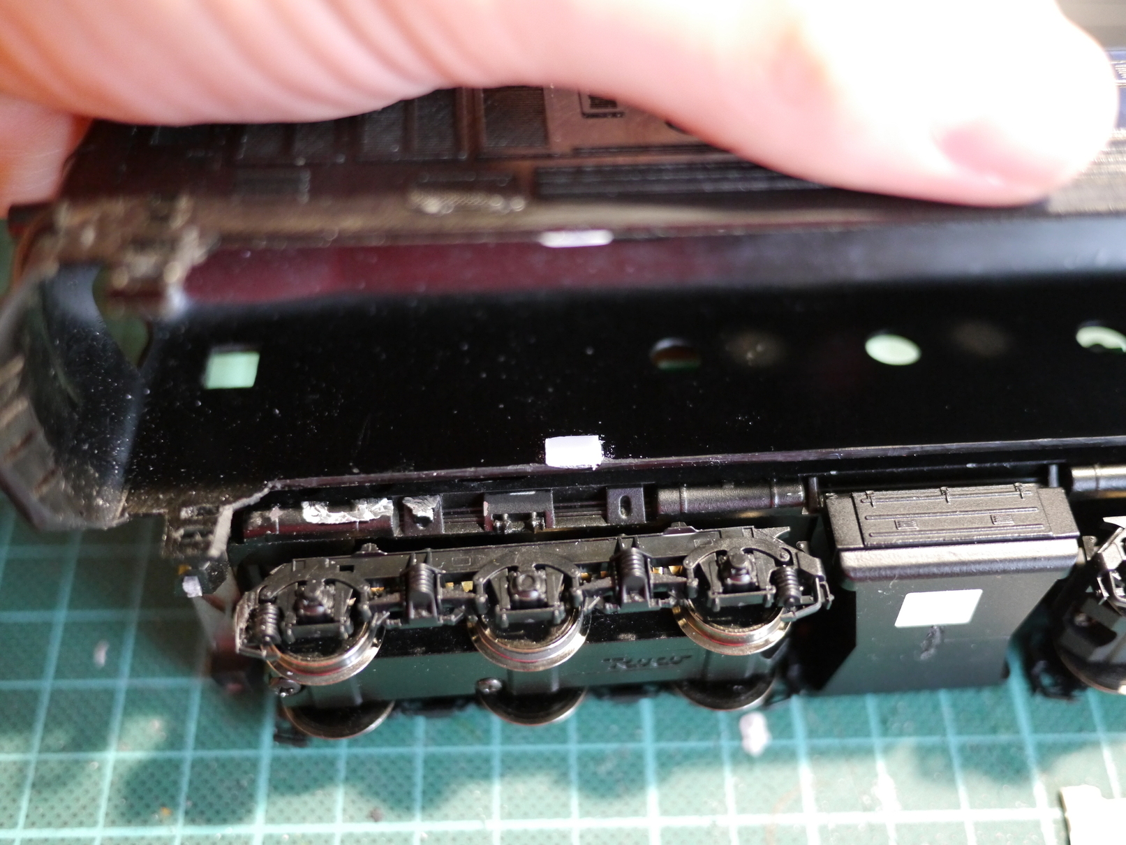 Третье - фиксация кузова. Тут неожиданно "стали у пригоді" декоративные элементы рамы. Между ними - великолепный паз. Потому мне осталось только вырезать квадратики полистирола, приклеить и обточить. Теперь кузов фиксируется отлично - защелкивается на раме как родной.