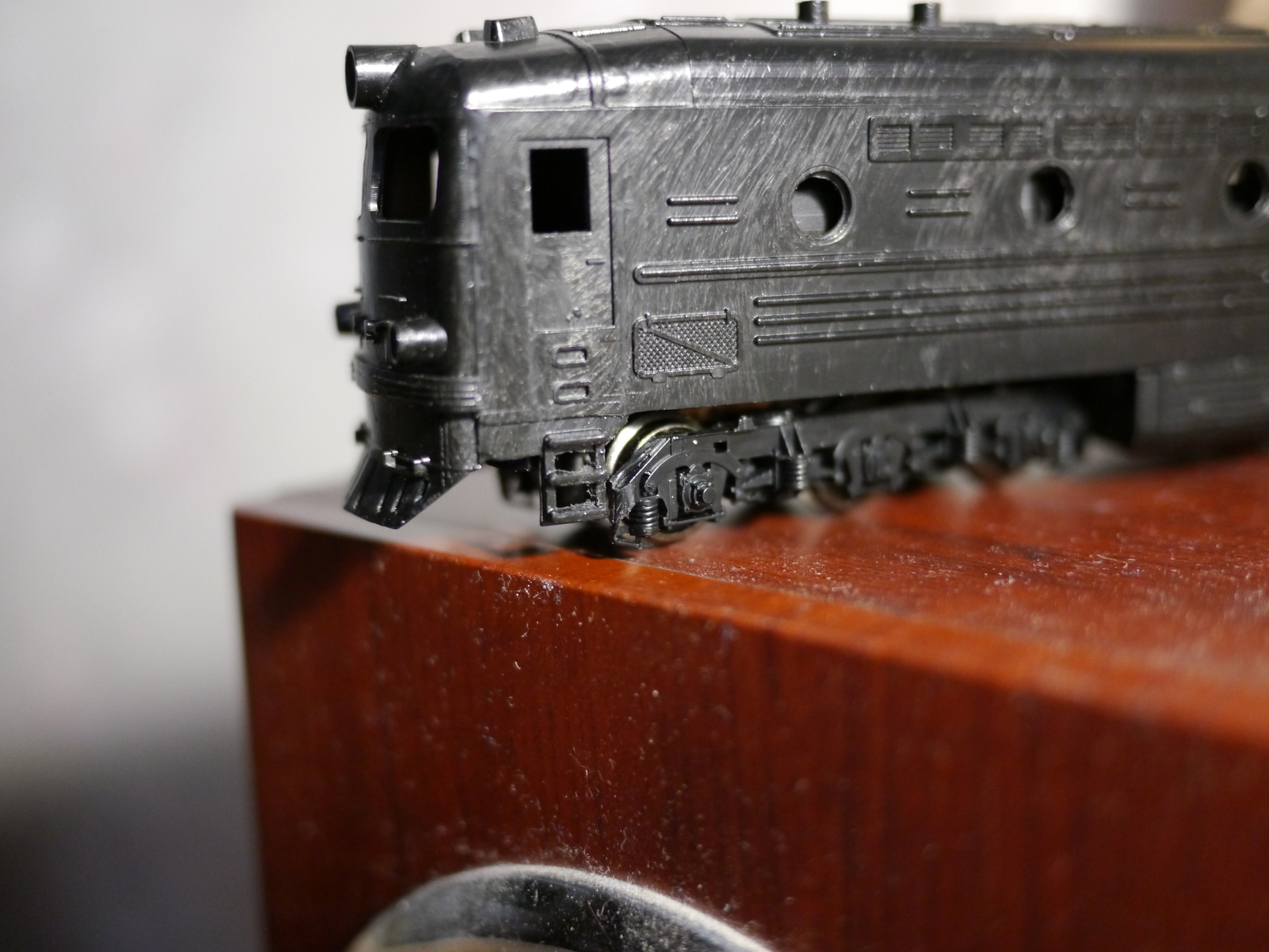 Второй момент, над которым надо поработать - лесенки. Во-первых, они залиты облоем, то есть в промежутке между ступенями толстый слой пластика (чтобы не соврать - толщиной миллиметра полтора!). Пришлось выточить дремелем. Во-вторых, они мешают нормальному повороту телег. Пришлось чуть поработать надфилем и над боковинами телег.