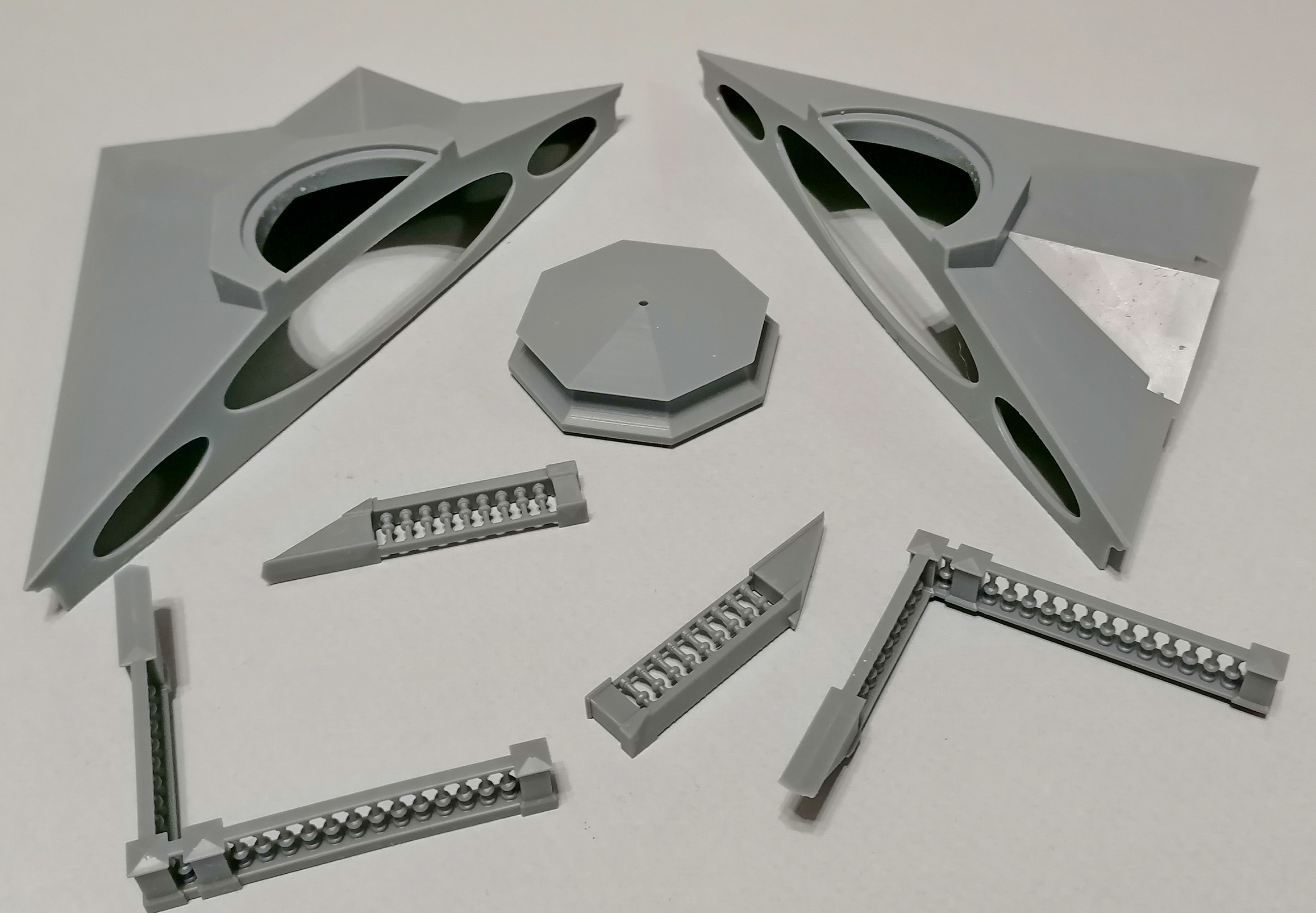 Часть деталей ещё печатается - это шпиль весьма оригинальной формы, фонари, ограды и др. мелочь. Основная часть вот: Потихоньку склеиваю и зачищаю.