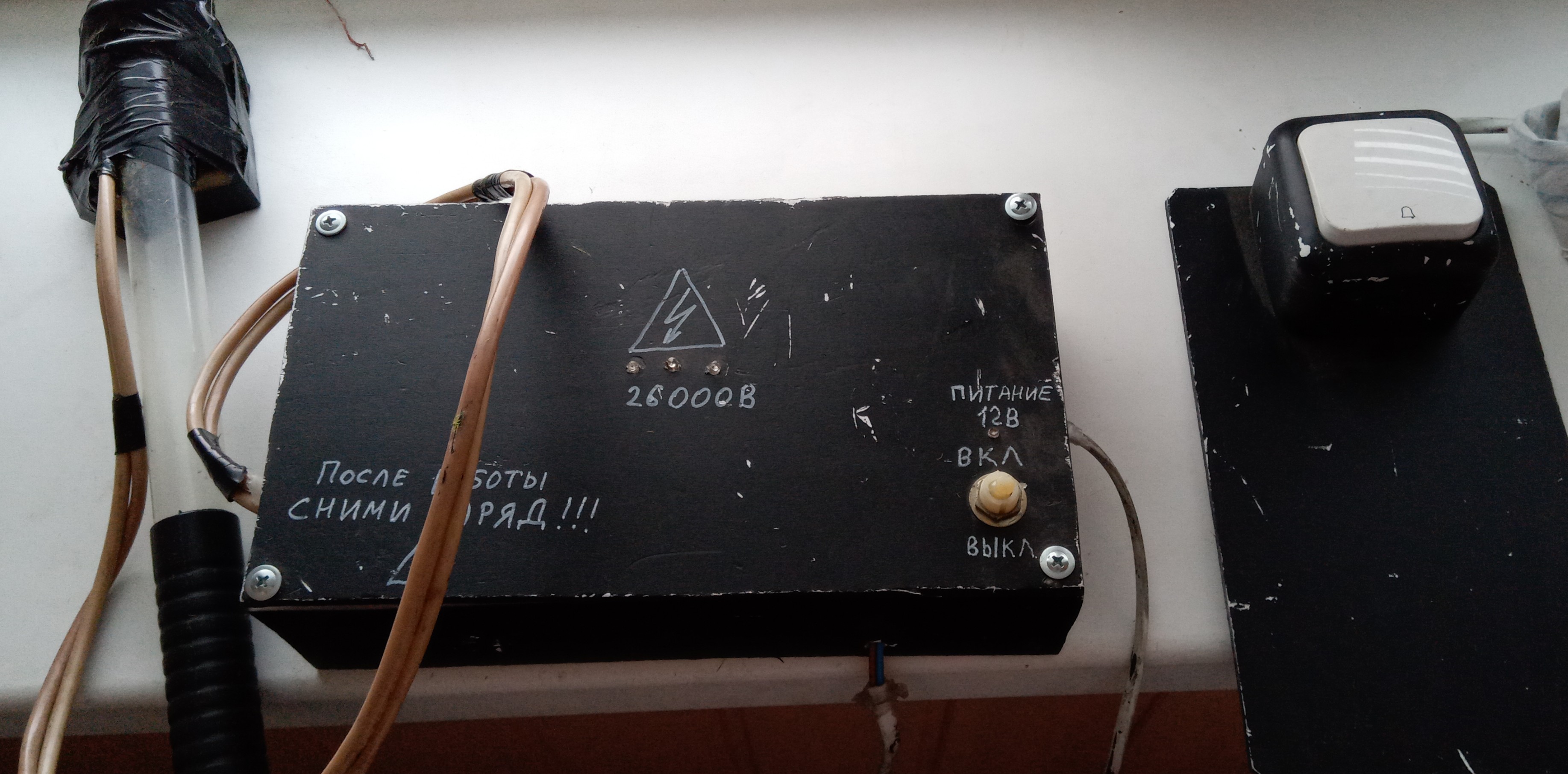 Фото1. На днях благополучно сжёг свой флокатор на ТВС с выходным напряжением по расчету 26000В, испытанный в сравнении с флокатором из мухобойки во время приезда к Юрию Александровичу в свое время. Флокатор был собран из подручных элементов почти даром, но не мной. В данный момент пришел к выводу, что ремонтировать его экономически нецелесообразно, да и неудобство при использовании достало. Фото 2. Срочно была приобретена мухобойка на аккумуляторн с известным напряжением на выходе 3500В и за пару часов превращена во флокатор. Описывать процесс превращения не буду, так как он описан в Ютубе многими людьми.