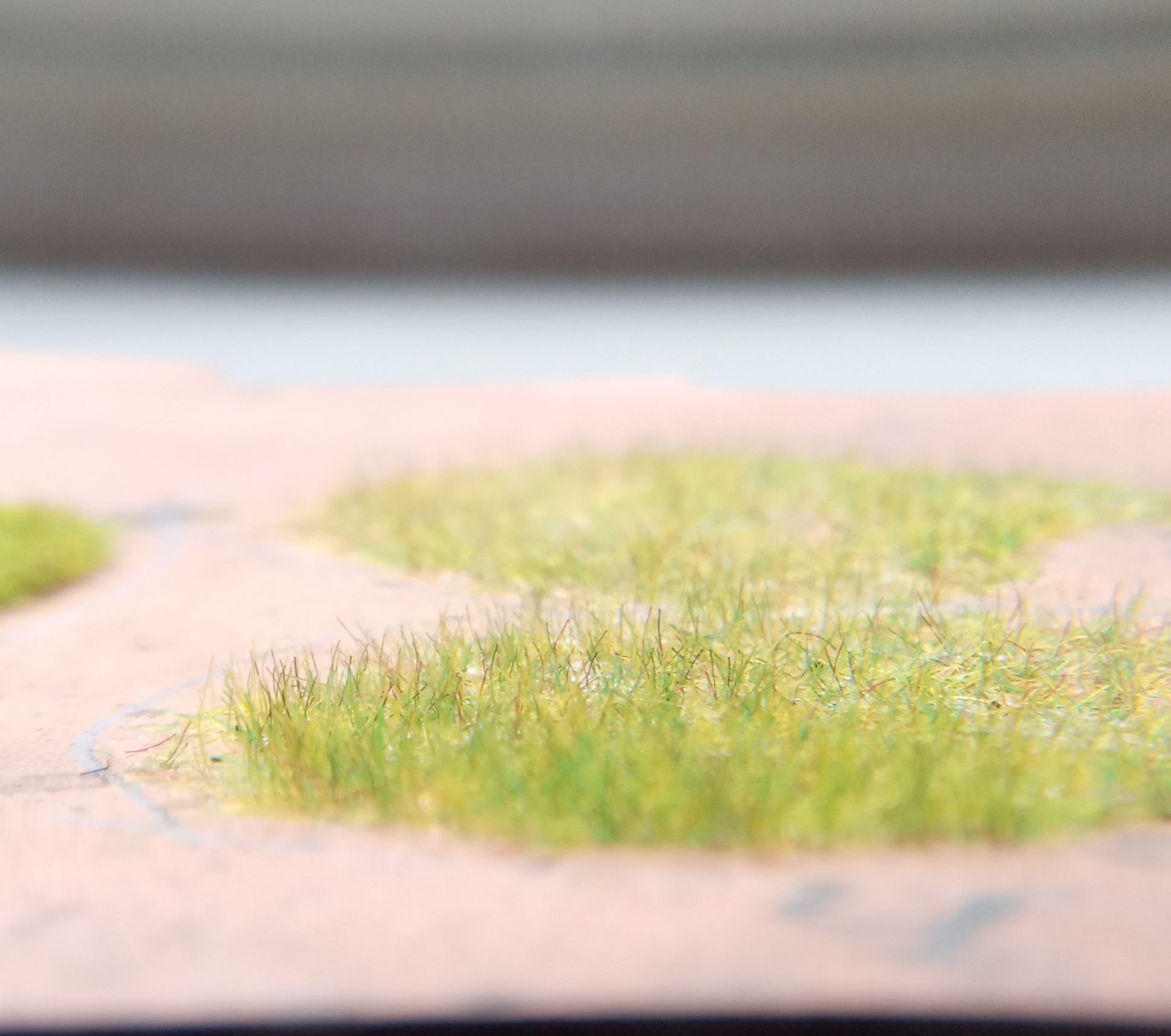 . Да, чуть не забыл. Будьте осторожны с клеем ПВА. Мне попался такой, который при высыхании остался белым и начал очень хорошо просвечивать под флоком. Был отправлен на другие цели и заменён клеем Дракон. Ещё заметил, что чем гуще сыпать флок, тем менее видно его вертикальность. Часть ворсинок падает на уже стоящие ворсинки, путается в них и лежит под разными углами. Ещё на основе разного цвета ковер смотрится по разному. На черной земле даже "весенний луг" темнее, а на темно-желтом темный флок как бы светлеет.