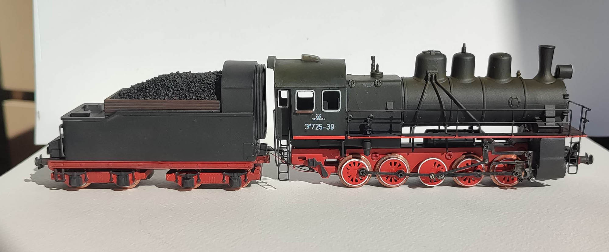 Доделал Эм. К сожалению при лакировке паровоза вышел брак и пришлось смывать краску с декалями. Так что на тендере и паровозе разные номера. Как будет настроение, то вклею стекла. Ток снимается со всех колпар тендера и 2х колпар паровоза. Можно было и больше, но усики заметно затрудняют движение и выбрал золотую середину между токосьемом и сопротивлением движению.