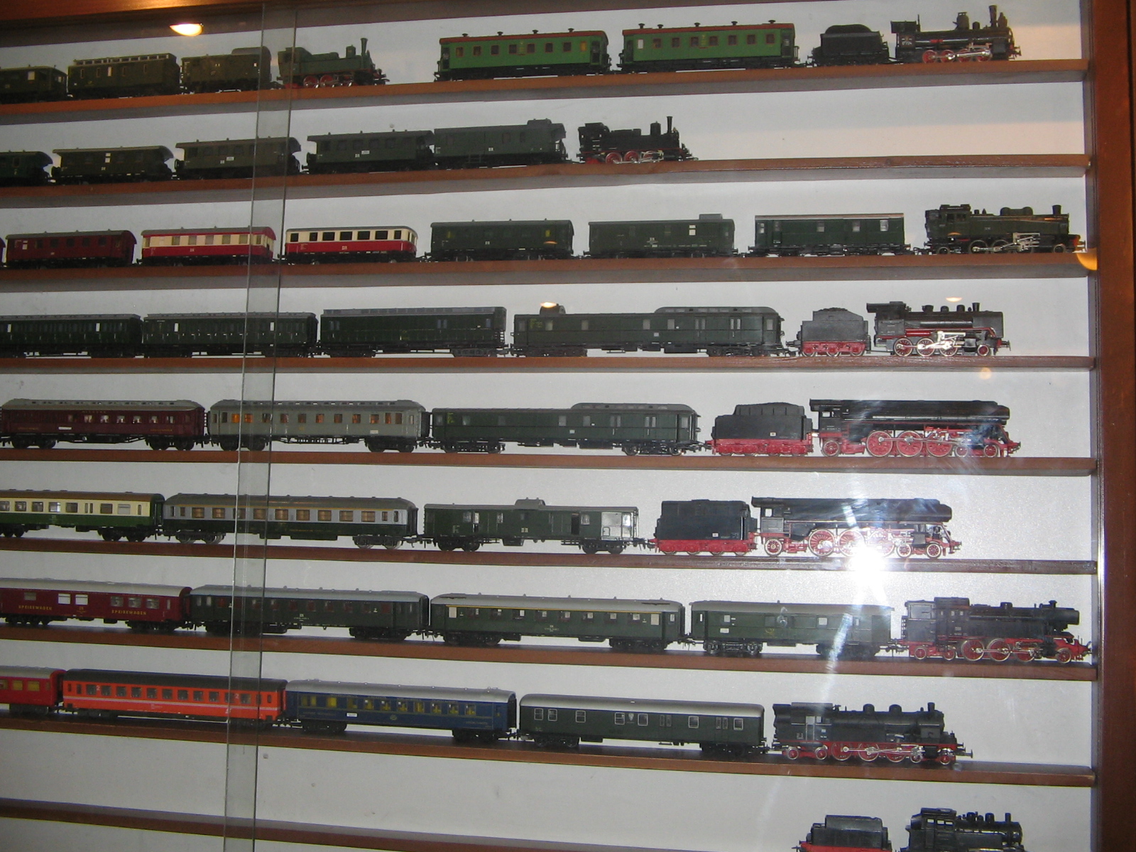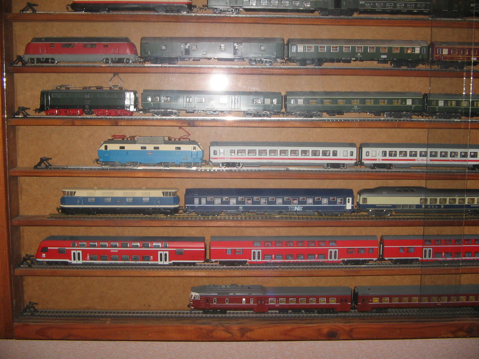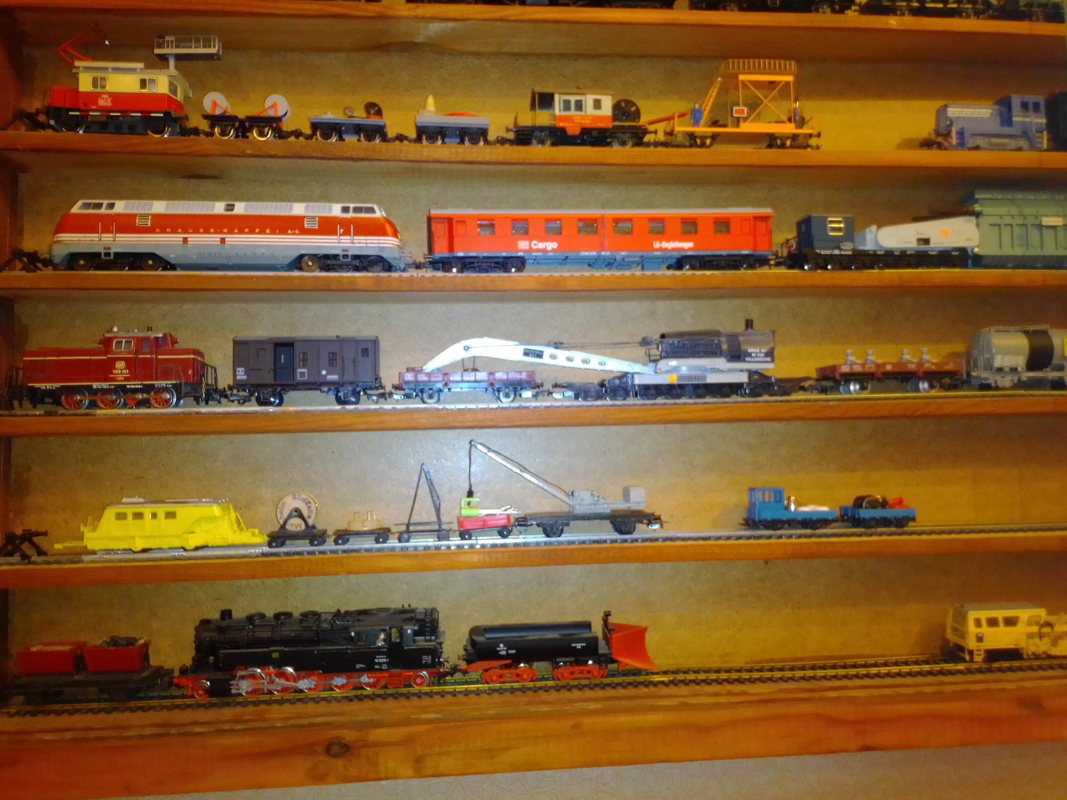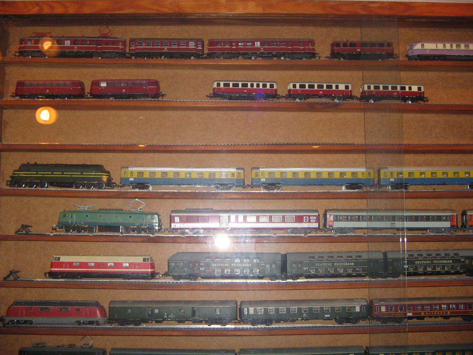 Здравствуйте, уважаемые моделисты и коллекционеры! Начал коллекционировать НО в далеком 1970 году. Собирались тогда возле магазина "Юный техник" в Киеве, на бульваре Леси Украинки. Мало нас тогда было... Максимум человек 10 встречались по четвергам и общались, обменивались, продавали... Увлекся, начал собирать понемногу, собирался строить макет (естественно, покупался не только подвижный состав, но также домики, семафоры, светофоры..., вообщем, все необходимое для создания полноценного макета. Со временем, немецкие студенты привозили мне разнообразную продукцию ГДР. Короче говоря, собрал небольшую коллекцию, которую решил разместить в специально изготовленных витринах. Исходя из длины состава, состоящего из 4 - 5 4-х осных пассажирских вагонов и локомотива, длина полочек для витрин составила 1600 мм., при высоте, сейчас точно не помню, но где-то больше метра (12 полок по 1 см., толщиной и 7 см. расстояние между ними). Наполнение следующее (хронология сверху вниз): 1 -я, пассажирские составы с тепловозами, электровозами, моторными вагонами; 2-я, спецсоставы (моя любимая витрина: восстановительные, строительные, для ремонта контактной сети, перевозка негабаритных грузов и т.д.); 3-я, пассажирские составы с паровозами, последняя полка: американская тематика; 4-я, товарные составы. Перед установкой составов в витрины, рассчитывал по длине и комплектовал все в WORD, так что если кого-то заинтересует моя комплектация, - могу сбросить файлы. Кто-то может решить иначе, а мне нравится ИМЕННО такая подборка. А то, что коллекция не в коробках, а на витринах, - радует глаза и согревает душу...