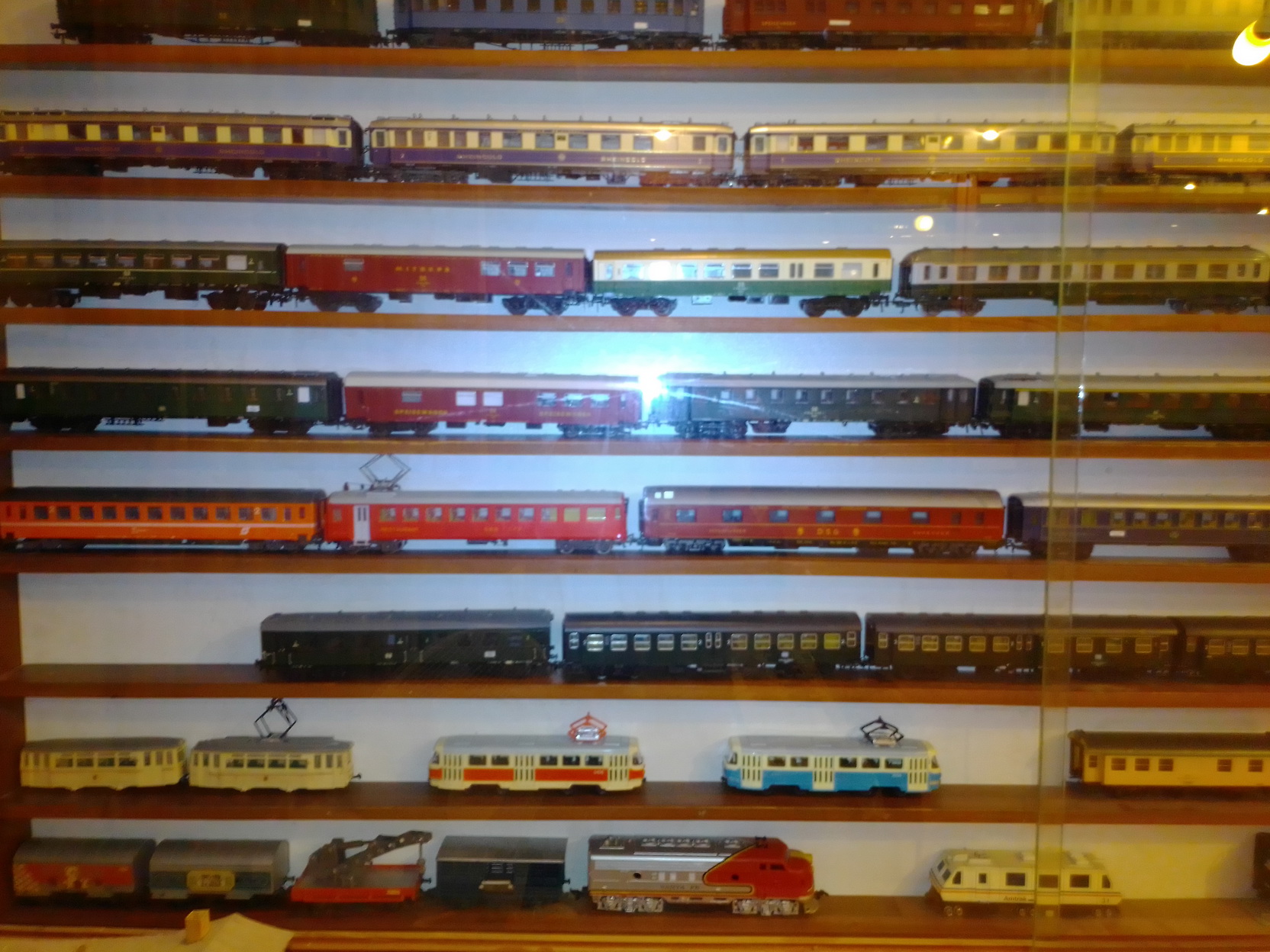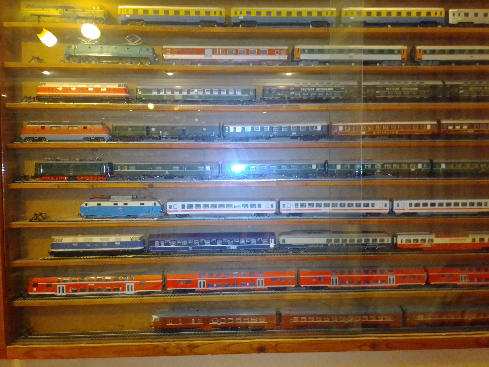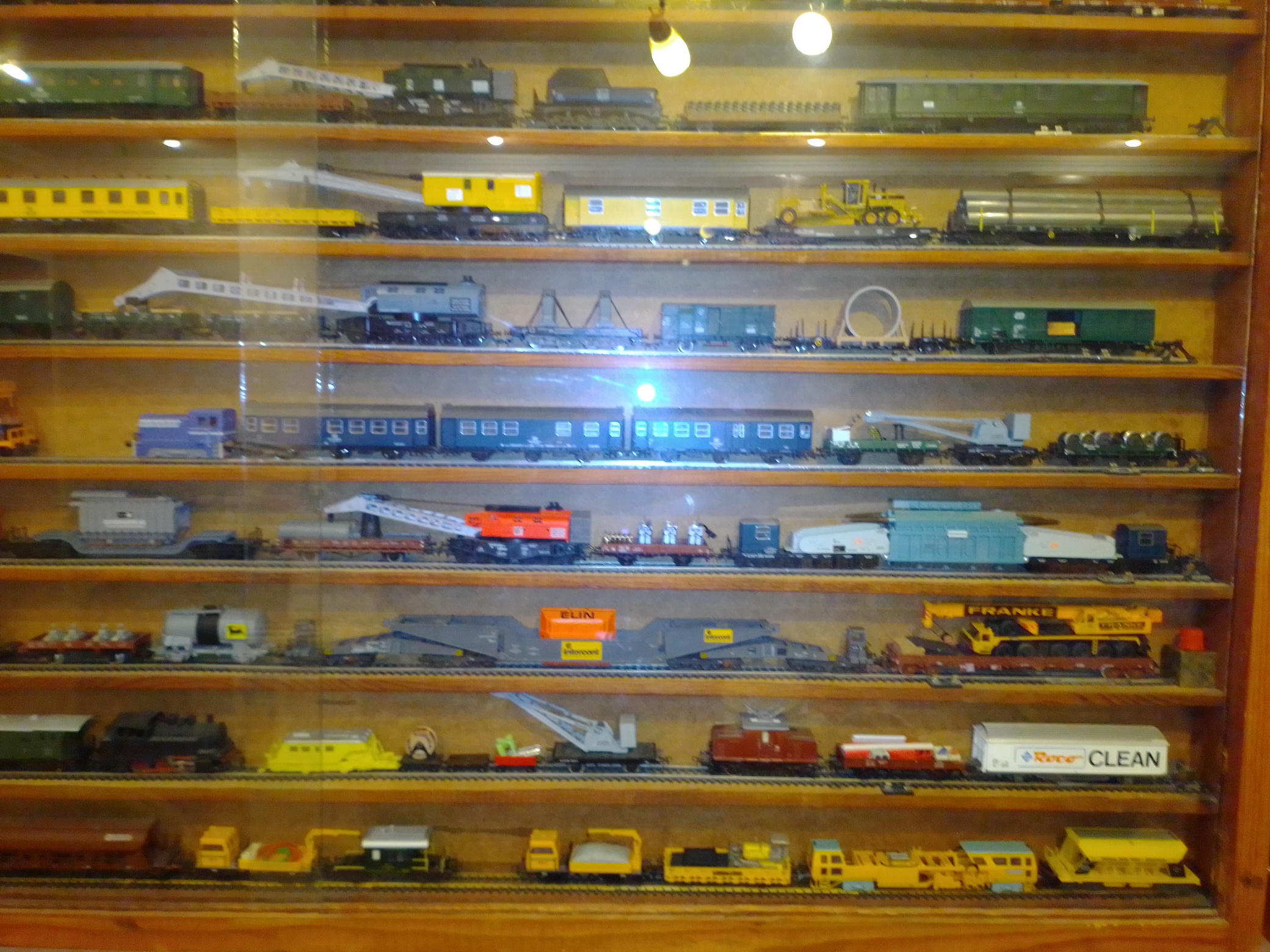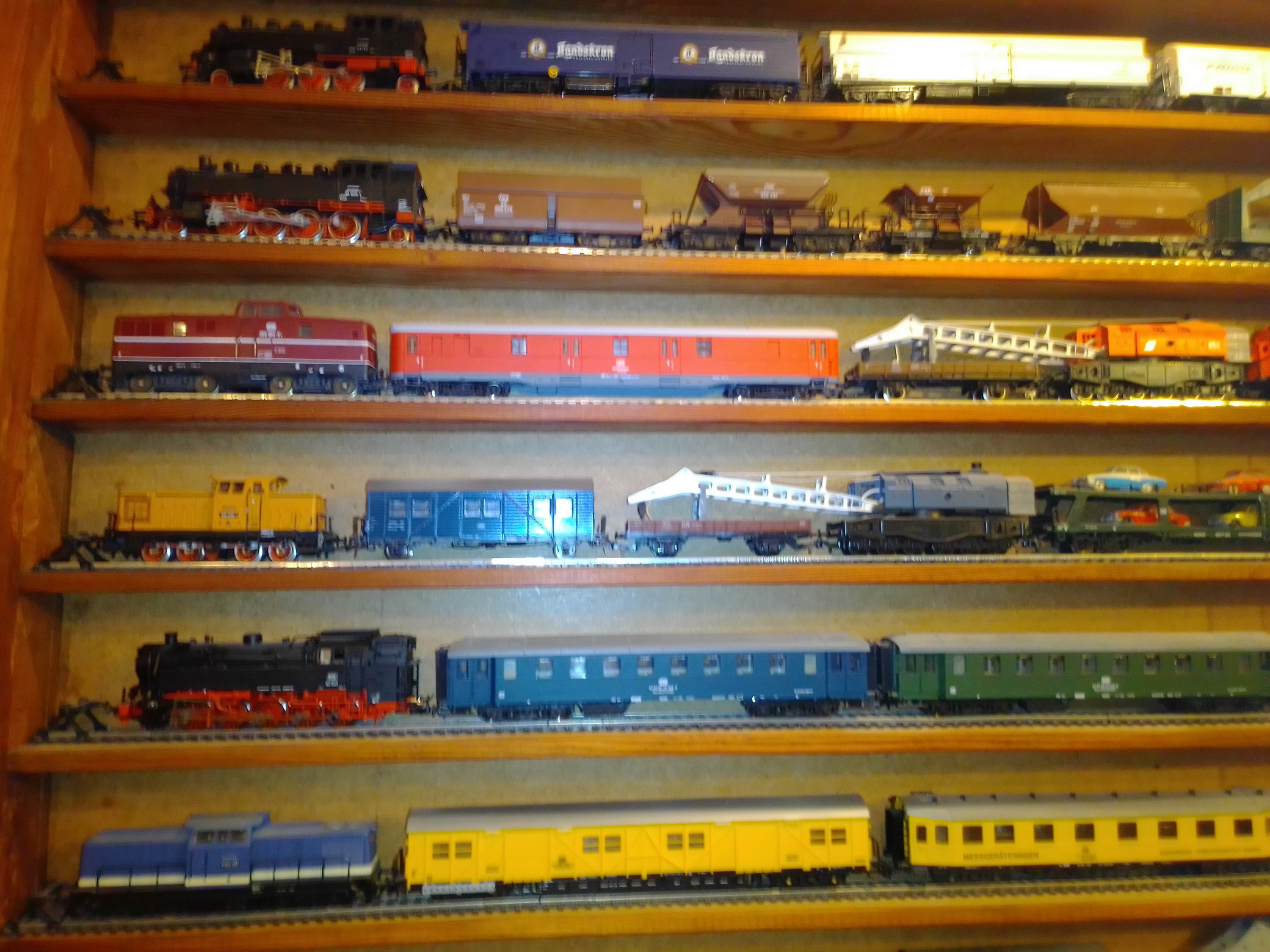 Здравствуйте, уважаемые моделисты и коллекционеры! Начал коллекционировать НО в далеком 1970 году. Собирались тогда возле магазина "Юный техник" в Киеве, на бульваре Леси Украинки. Мало нас тогда было... Максимум человек 10 встречались по четвергам и общались, обменивались, продавали... Увлекся, начал собирать понемногу, собирался строить макет (естественно, покупался не только подвижный состав, но также домики, семафоры, светофоры..., вообщем, все необходимое для создания полноценного макета. Со временем, немецкие студенты привозили мне разнообразную продукцию ГДР. Короче говоря, собрал небольшую коллекцию, которую решил разместить в специально изготовленных витринах. Исходя из длины состава, состоящего из 4 - 5 4-х осных пассажирских вагонов и локомотива, длина полочек для витрин составила 1600 мм., при высоте, сейчас точно не помню, но где-то больше метра (12 полок по 1 см., толщиной и 7 см. расстояние между ними). Наполнение следующее (хронология сверху вниз): 1 -я, пассажирские составы с тепловозами, электровозами, моторными вагонами; 2-я, спецсоставы (моя любимая витрина: восстановительные, строительные, для ремонта контактной сети, перевозка негабаритных грузов и т.д.); 3-я, пассажирские составы с паровозами, последняя полка: американская тематика; 4-я, товарные составы. Перед установкой составов в витрины, рассчитывал по длине и комплектовал все в WORD, так что если кого-то заинтересует моя комплектация, - могу сбросить файлы. Кто-то может решить иначе, а мне нравится ИМЕННО такая подборка. А то, что коллекция не в коробках, а на витринах, - радует глаза и согревает душу...