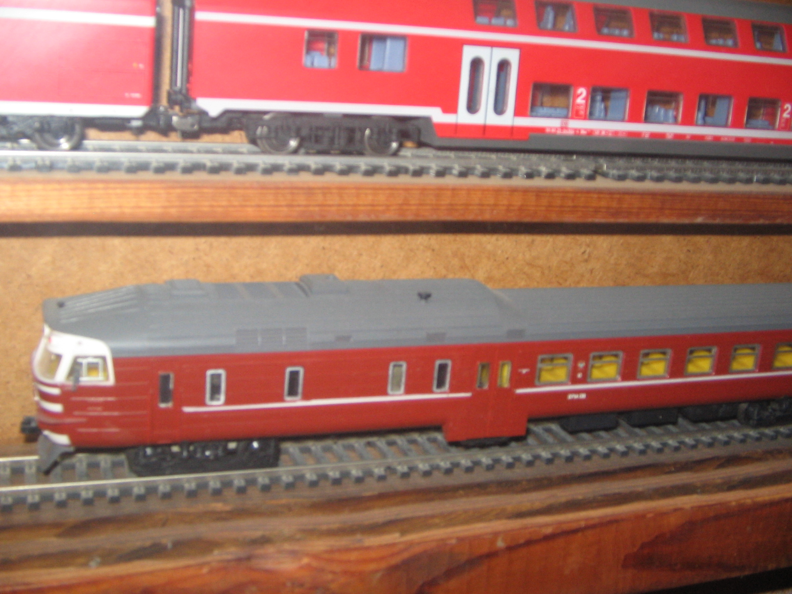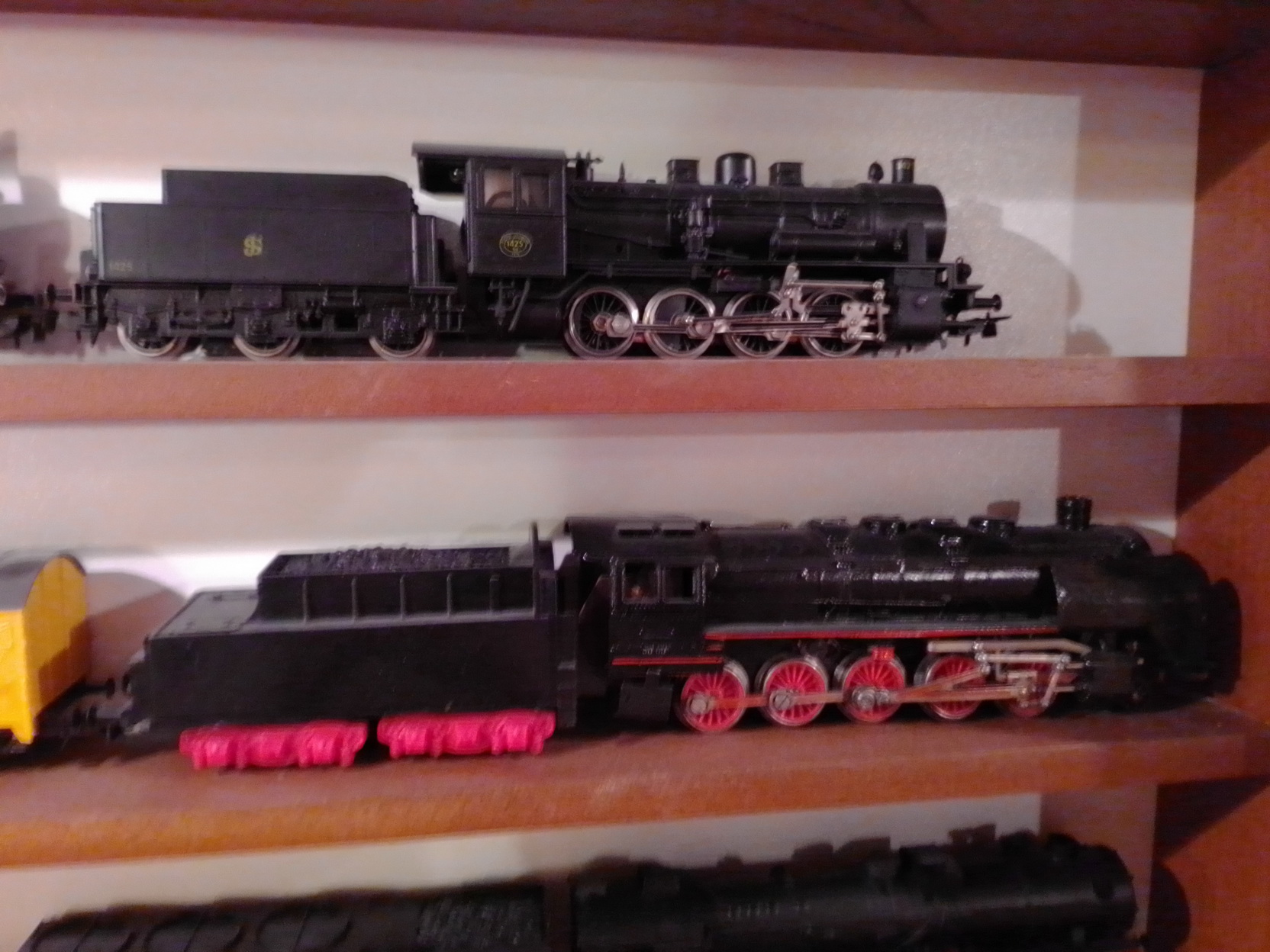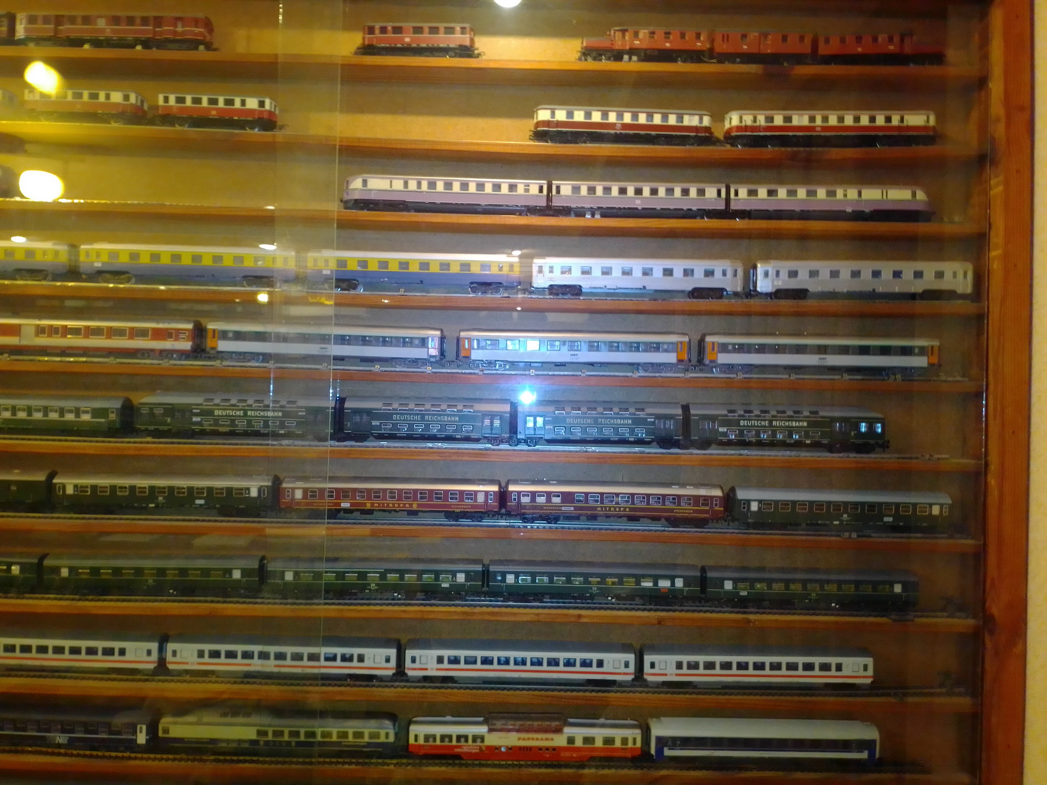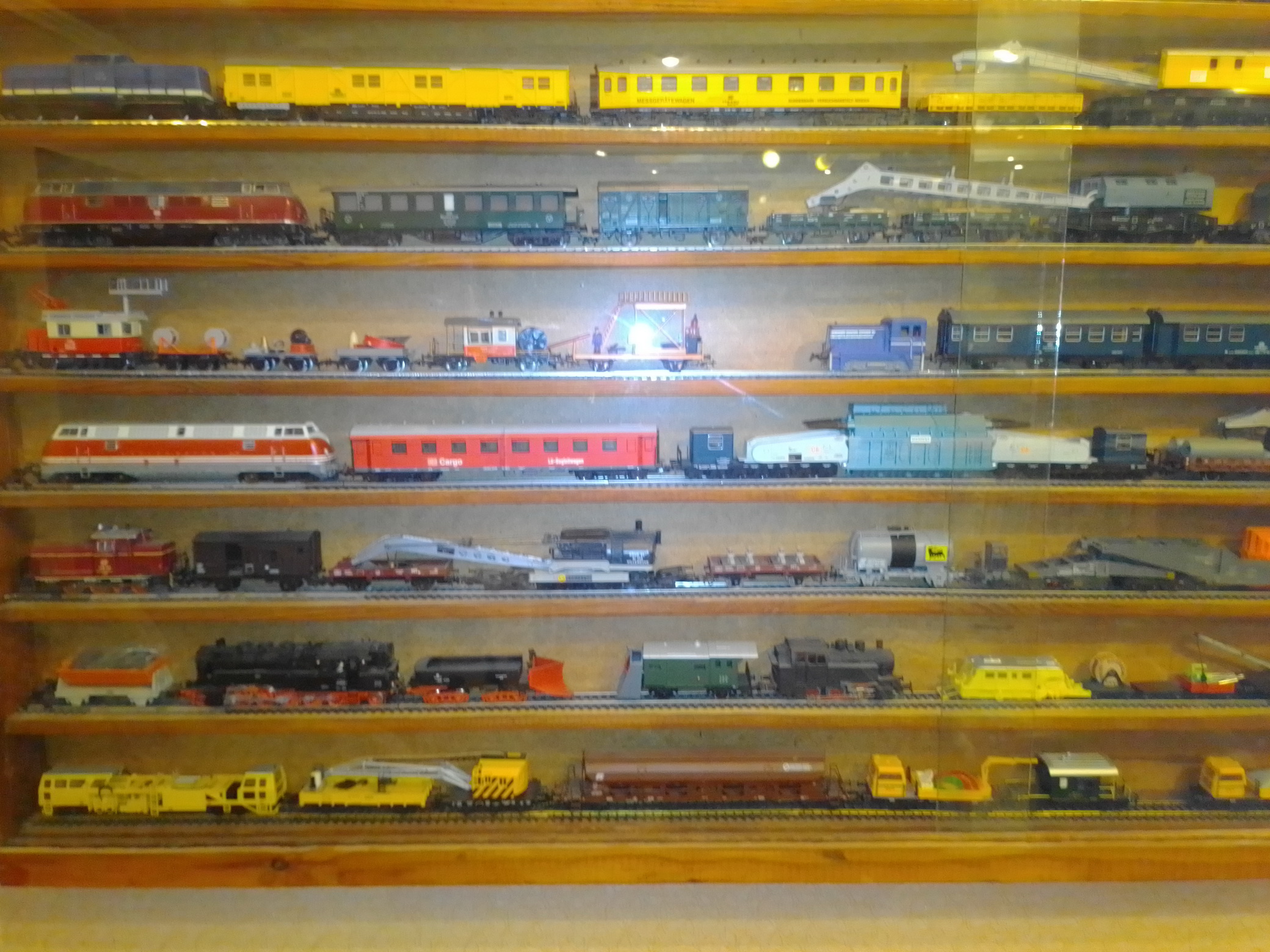 Здравствуйте, уважаемые моделисты и коллекционеры! Начал коллекционировать НО в далеком 1970 году. Собирались тогда возле магазина "Юный техник" в Киеве, на бульваре Леси Украинки. Мало нас тогда было... Максимум человек 10 встречались по четвергам и общались, обменивались, продавали... Увлекся, начал собирать понемногу, собирался строить макет (естественно, покупался не только подвижный состав, но также домики, семафоры, светофоры..., вообщем, все необходимое для создания полноценного макета. Со временем, немецкие студенты привозили мне разнообразную продукцию ГДР. Короче говоря, собрал небольшую коллекцию, которую решил разместить в специально изготовленных витринах. Исходя из длины состава, состоящего из 4 - 5 4-х осных пассажирских вагонов и локомотива, длина полочек для витрин составила 1600 мм., при высоте, сейчас точно не помню, но где-то больше метра (12 полок по 1 см., толщиной и 7 см. расстояние между ними). Наполнение следующее (хронология сверху вниз): 1 -я, пассажирские составы с тепловозами, электровозами, моторными вагонами; 2-я, спецсоставы (моя любимая витрина: восстановительные, строительные, для ремонта контактной сети, перевозка негабаритных грузов и т.д.); 3-я, пассажирские составы с паровозами, последняя полка: американская тематика; 4-я, товарные составы. Перед установкой составов в витрины, рассчитывал по длине и комплектовал все в WORD, так что если кого-то заинтересует моя комплектация, - могу сбросить файлы. Кто-то может решить иначе, а мне нравится ИМЕННО такая подборка. А то, что коллекция не в коробках, а на витринах, - радует глаза и согревает душу...