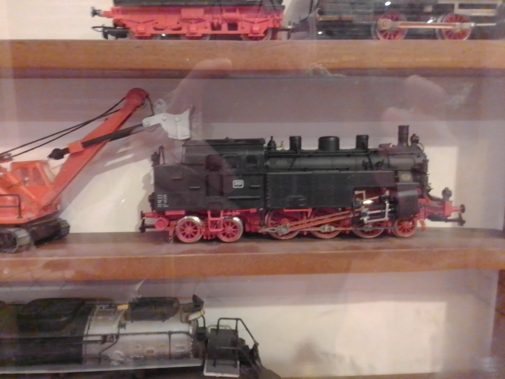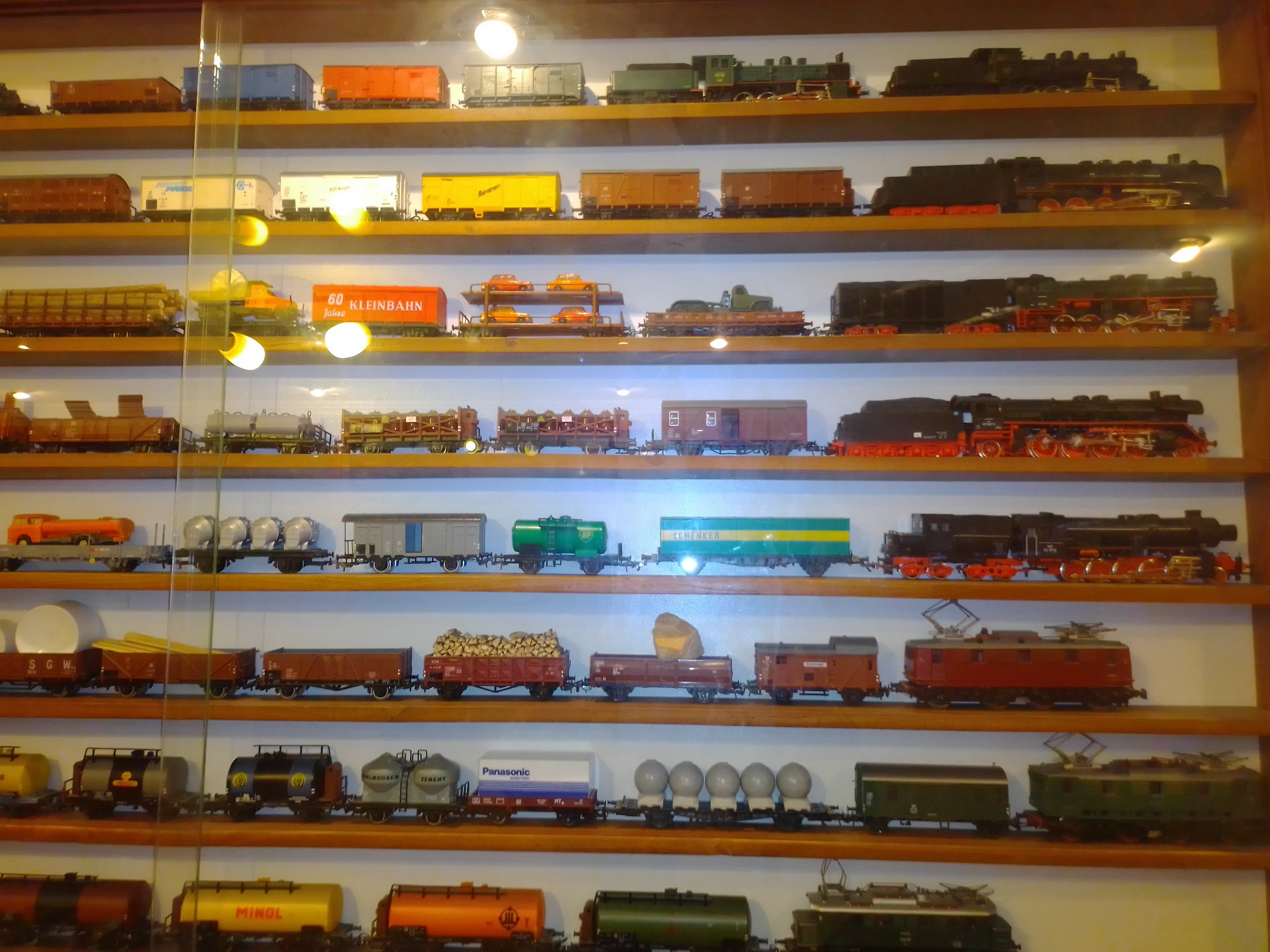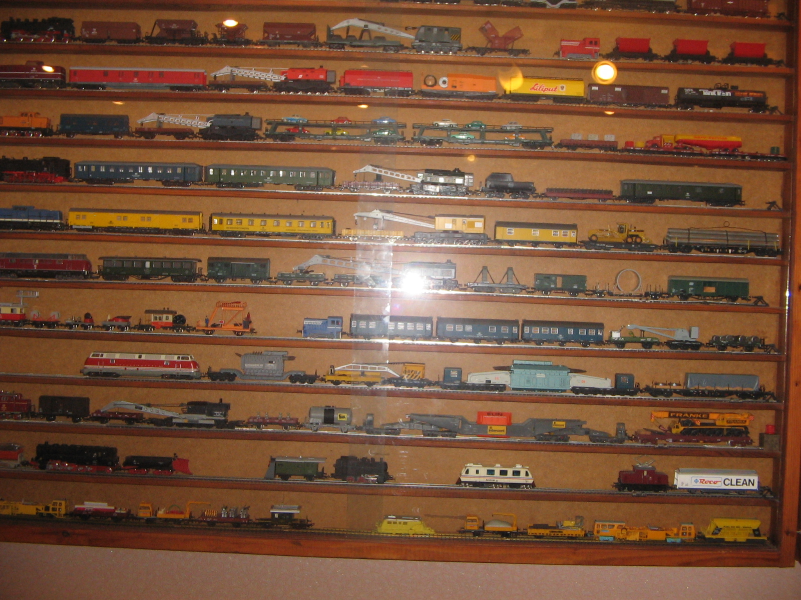 To Stinky, У меня есть фотки, где стекло сдвинуто. Увы, все равно, видно плохо. Да и со стеклом (5 мм.)..., его вырезали чуть - чуть "с запасом" и я его еле еле вставил с помощью жены. А что касается аксессуаров..., - так они покупались постепенно и тогда, в основном (не считая поворотного круга и веерного депо) были еще пленочные фотоаппараты. То, что приобреталось на аукционах, в основном на eBay, - фото, сделанные продавцами, сохранились. У меня тоже есть претензии к некоторым своим составам, но я уже писал, - так получилось... 2-х осные вагоны не ставят в состав с 4-х осными, - в кривых их выталкивает...Вижу огрехи, например, на одной тележке Лимовской цистерны "BUTAGAZ", стоит генератор... Так купил, а где я найду такую тележку, "без"? Тут еще, если заметили, на витринах №№ 3 и 4, модели стоят просто на деревянных полках. Рельсы есть, но их надо достать, снять составы, поставить рельсы, а на них составы... Может быть как-то и соберусь, но для меня это неделя работы...