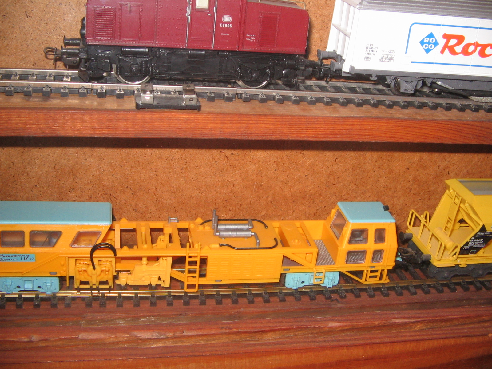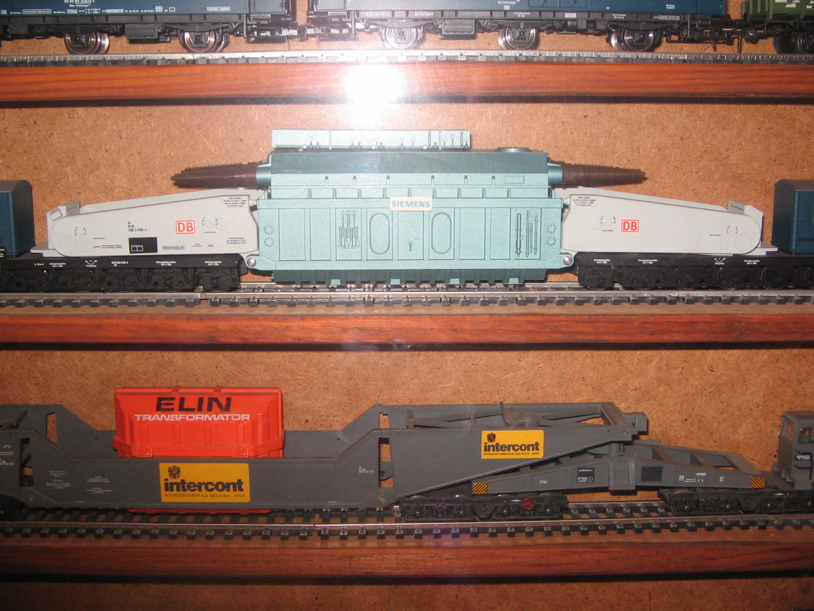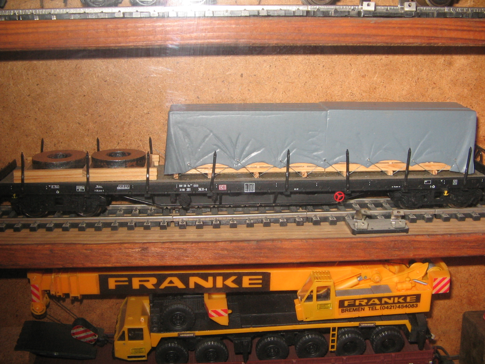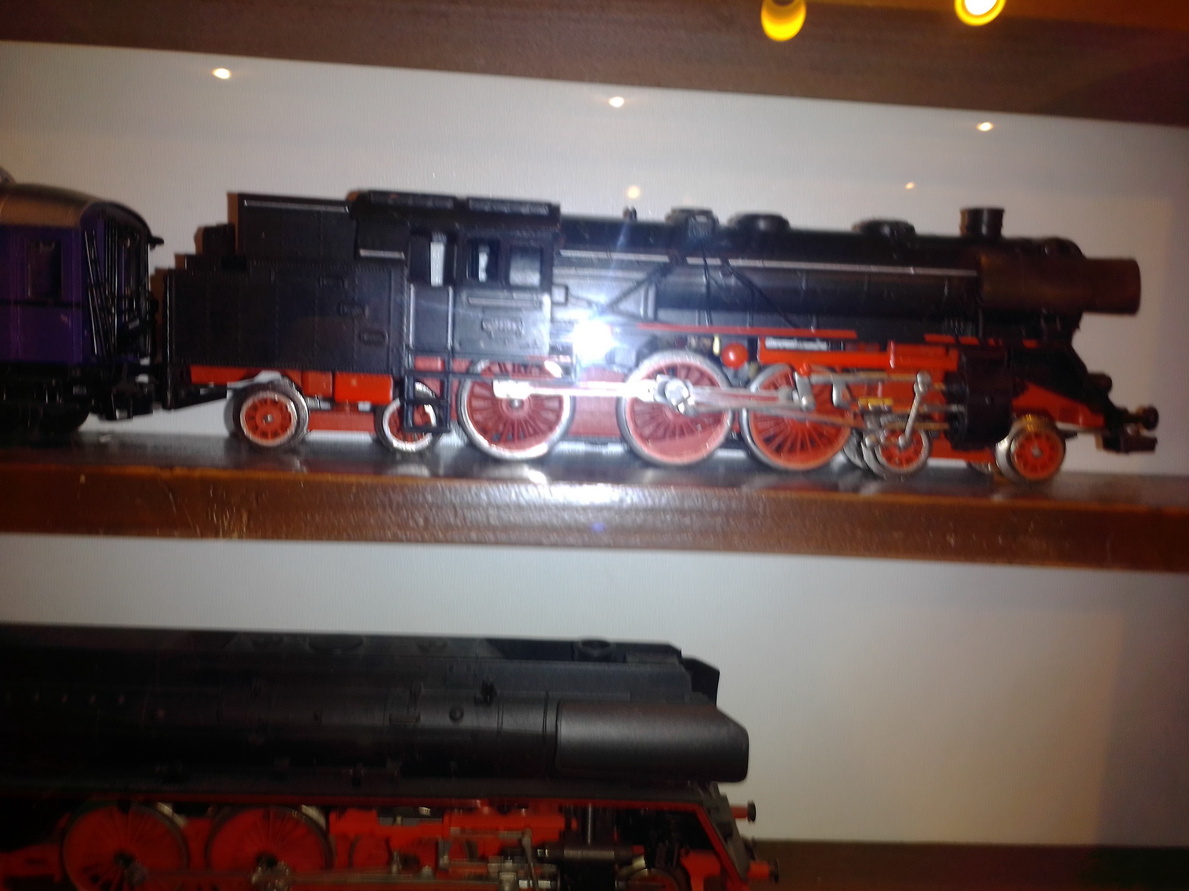 To Stinky, У меня есть фотки, где стекло сдвинуто. Увы, все равно, видно плохо. Да и со стеклом (5 мм.)..., его вырезали чуть - чуть "с запасом" и я его еле еле вставил с помощью жены. А что касается аксессуаров..., - так они покупались постепенно и тогда, в основном (не считая поворотного круга и веерного депо) были еще пленочные фотоаппараты. То, что приобреталось на аукционах, в основном на eBay, - фото, сделанные продавцами, сохранились. У меня тоже есть претензии к некоторым своим составам, но я уже писал, - так получилось... 2-х осные вагоны не ставят в состав с 4-х осными, - в кривых их выталкивает...Вижу огрехи, например, на одной тележке Лимовской цистерны "BUTAGAZ", стоит генератор... Так купил, а где я найду такую тележку, "без"? Тут еще, если заметили, на витринах №№ 3 и 4, модели стоят просто на деревянных полках. Рельсы есть, но их надо достать, снять составы, поставить рельсы, а на них составы... Может быть как-то и соберусь, но для меня это неделя работы...