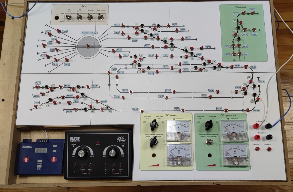 Итого на сегодня готов сам пульт. К нему подведены кабели питания для для 30 рельсовых цепей. Для остальных 30 не хватило кабеля для "последней мили". Кабели подведены и оконечены разъемами к месту установки пульта. Осталось только спаять кабель от самого пульта к этим разъемам. Аналоговые тяги запитываются от внешнего источника (лабораторный блок питания), цифровые - от пульта DCC Twin фирмы NCE. Предусмотрено подключение внешнего цифрового пульта. Также в дальнейшем будут встроены два аналоговых блока питания - отдельно для промзоны и основного макета.