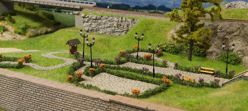Начал делать парк возле санатория. Пока что готовы дорожки и кусты вдоль дорожек. Фонари просто вставлены в отверстия, не приклеены, поэтому некоторые стоят не совсем вертикально. Деревья пока поставил из того, что было. По замыслу тут должны быть старые широкие разлапистые дубы. Но их еще нужно сделать...