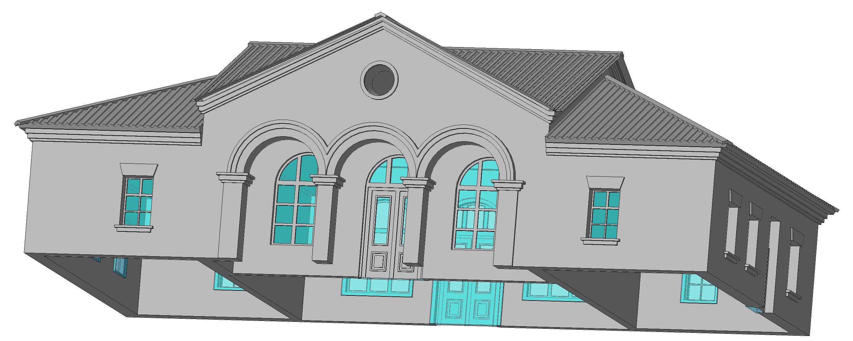 Белый кирпич, штукатурка, листовая кровля. Изюминкой проекта стали арочные окна и их фигурные наличники.