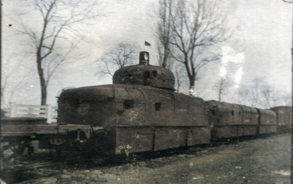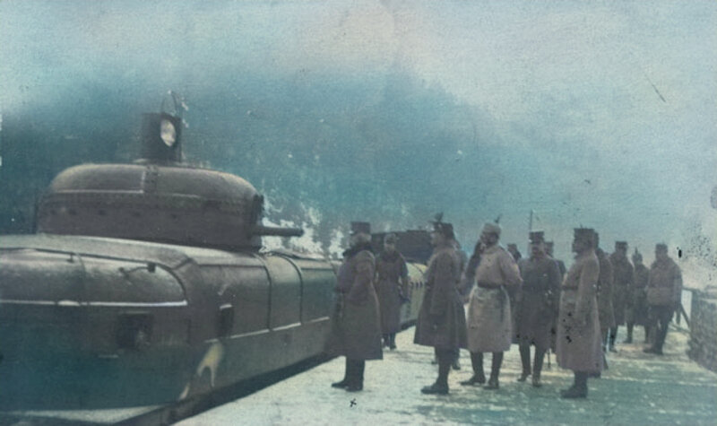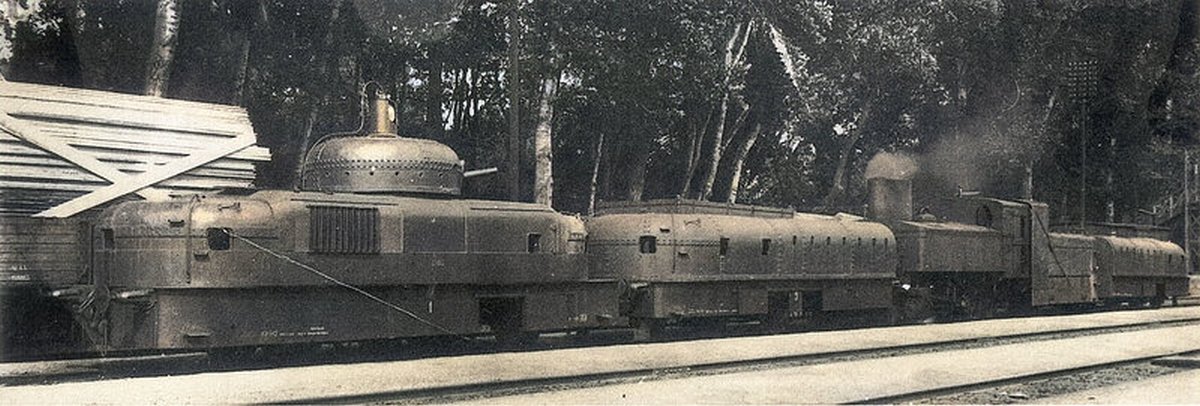 Австро-Угорщина, 1915 р. Це бронепоїзд Шобера, побудований 1914 року. Спочатку мав інший паровоз, виглядав так.