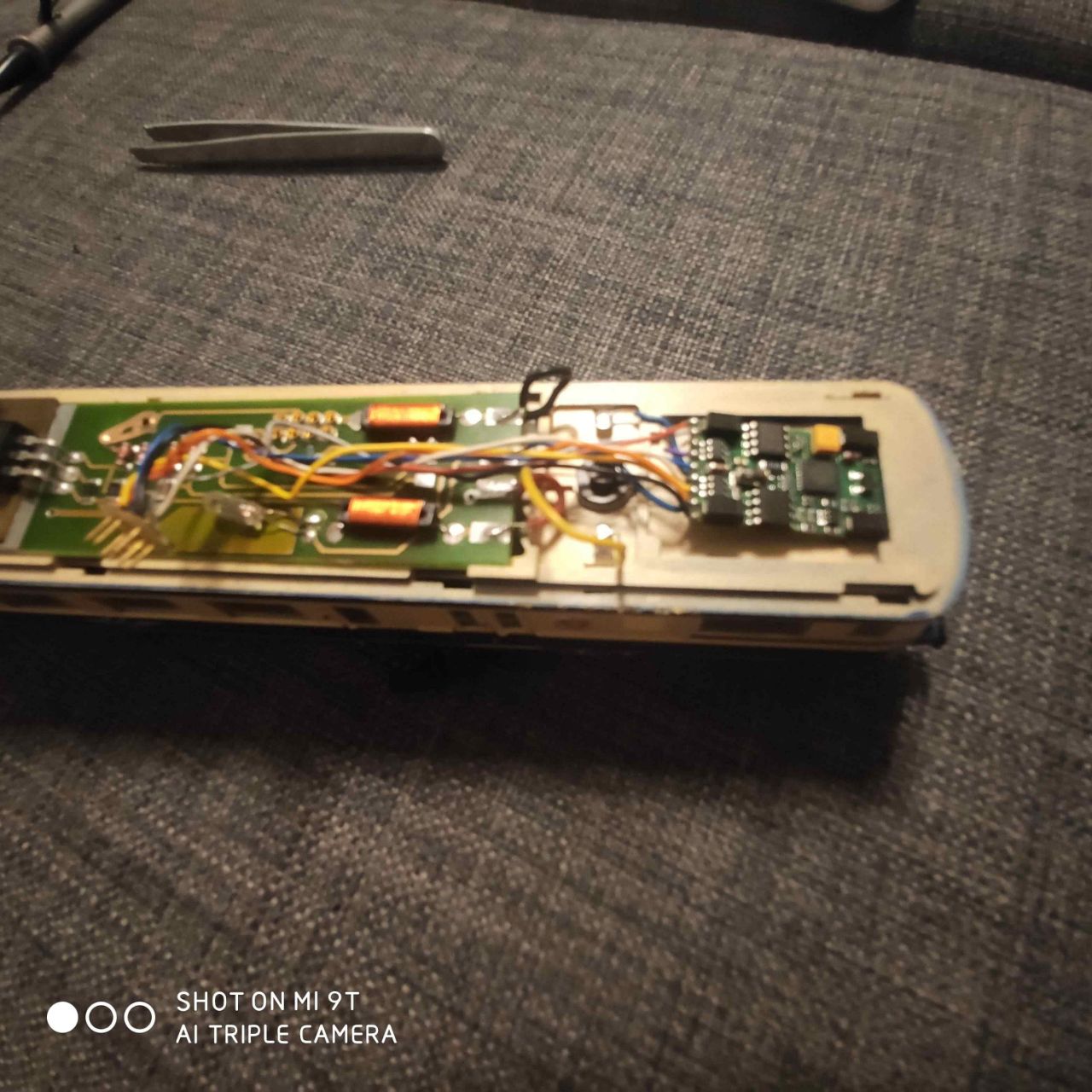 Немає там ніяких обірваних дротів. Є декодер, на дротах з нього добре видно роз`єм DCC. Відповідну частину роз`єму видно на платі. Треба її продзвонити на наявність КЗ. Якщо КЗ немає, можна спробувати підключити, і запустити вагон, адреса 3. Якщо не реагує, доведеться займатися більш детально.