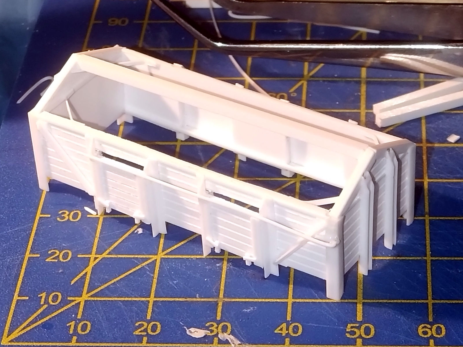 Сходу пришлось пойти на ограничение: буксовые лапы и буксы взяты безымянного мелкосерийщика, поскольку выточить это из пластика надфилем просто нереально. Увы, рессоры на них длиннее - они соответствуют более поздней (лет эдак на 50 минимум) конструкции, которая рассчитана на больший вес, аналогично буфера поставлены эпохи III. По ходу дела появилось еще одно ограничение: угловые стойки пришлось сделать не в масштабе и двери фиксированными из-за толщины материалов. Последним существенным упрощением стали связующие элементы верхней части кузова: на прототипе от них нет следов, соответственно, непонятно, были ли они, т.е. у вагонов без продольной балки их быть не должно, но вагоны с аналогичной конструкцией борта их имеют. Поскольку на прототипе их не нашлось, не стал и устанавливать. Все, кроме перечисленного, настолько попытался воспроизвести максимально, насколько это позволило клиническое рукожопие и тремор.