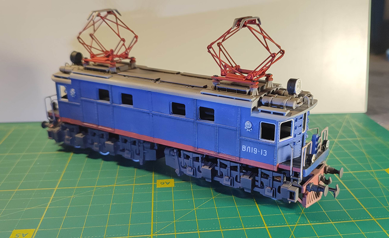практически окончил ВЛ-19. Стекла позднее напечатаю и вставлю, когда прозрачную смолу куплю. Свет по ходу движения, заднего красного нет. Фотографии прототипа нет, если не ошибаюсь 13й был в том же депо, что и евротрейновский 14й. С окраской кузова вышел небольшой брак, лак вступил похоже в реакцию с остатками моющего средства в акварели на смывке, потому немного белых точек и разводов присутствует на синем.
