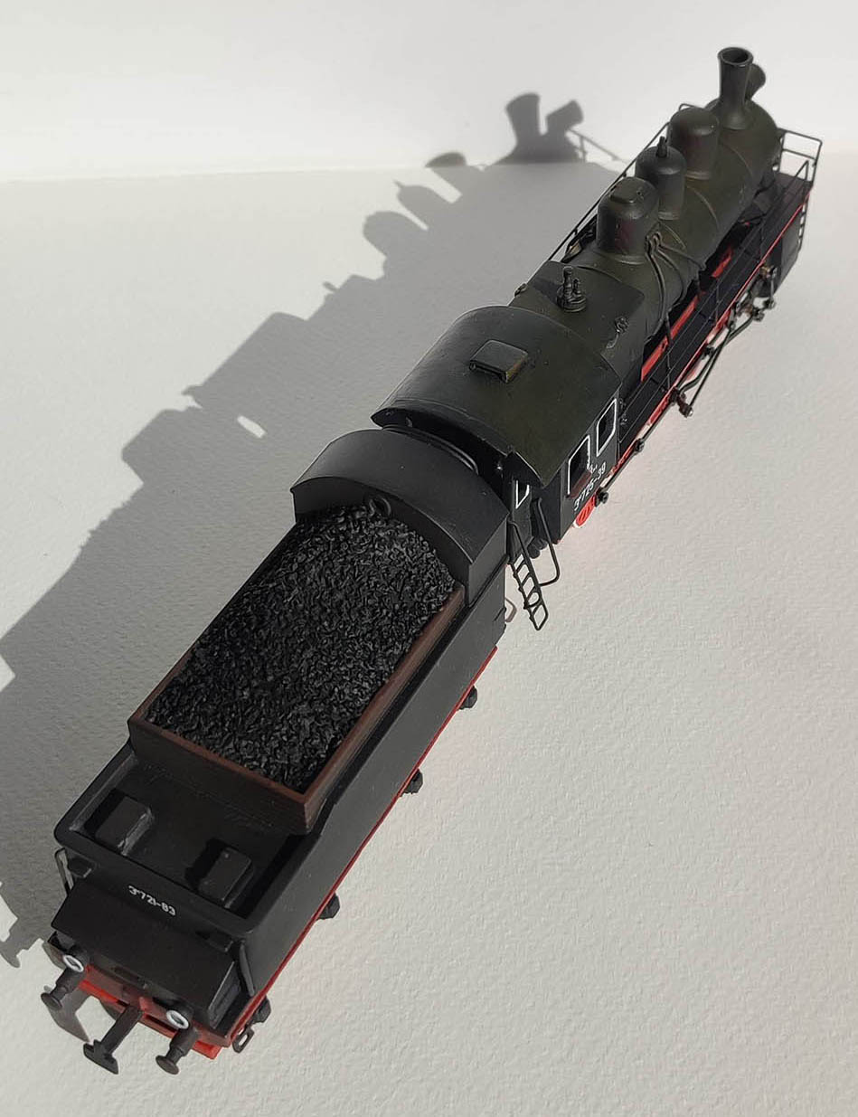 Доделал Эм. К сожалению при лакировке паровоза вышел брак и пришлось смывать краску с декалями. Так что на тендере и паровозе разные номера. Как будет настроение, то вклею стекла. Ток снимается со всех колпар тендера и 2х колпар паровоза. Можно было и больше, но усики заметно затрудняют движение и выбрал золотую середину между токосьемом и сопротивлением движению.