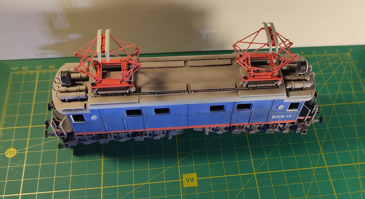 практически окончил ВЛ-19. Стекла позднее напечатаю и вставлю, когда прозрачную смолу куплю. Свет по ходу движения, заднего красного нет. Фотографии прототипа нет, если не ошибаюсь 13й был в том же депо, что и евротрейновский 14й. С окраской кузова вышел небольшой брак, лак вступил похоже в реакцию с остатками моющего средства в акварели на смывке, потому немного белых точек и разводов присутствует на синем.
