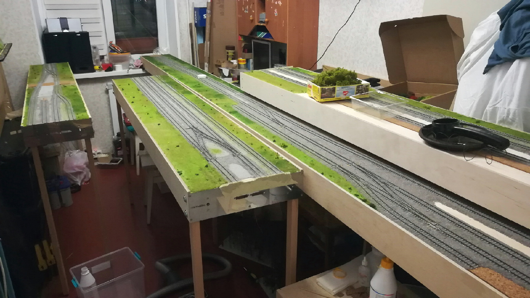 Ввечері після основної роботи майже кожного дня по декілька годин в кімнаті 3,9 х 3м по краях з одного боку заставленою коробками, а з іншого обладнанням та верстатами ми в двох з Іриною будували 5 модулів по 2м довжиною плюс розворотне коло 3 х 2м. Самий треш був в тому, що два з'єднаних між собою модулів від стіни до стіни не вміщались, а дома хозяйнувала кицька тому кожний вечір модулі роз'єднували щоб закрити кімнатні двері. Поки їхав рейковий матеріал (майже 2 тиждні) я встиг зпроектувати підмакетники, замовити необхідну фанеру та умовити хлопців, що мені роблять порізку взяти в работу моє замовлення позачергово. Паралельно виготовляв модульні фланці що теж зіжрало трохи часу. Також було пару вилазок на станцію (той іще квест...), шоб зробити фото та поміряти "кроками" розміри будівлі вокзалу що був збудований 120 років тому.