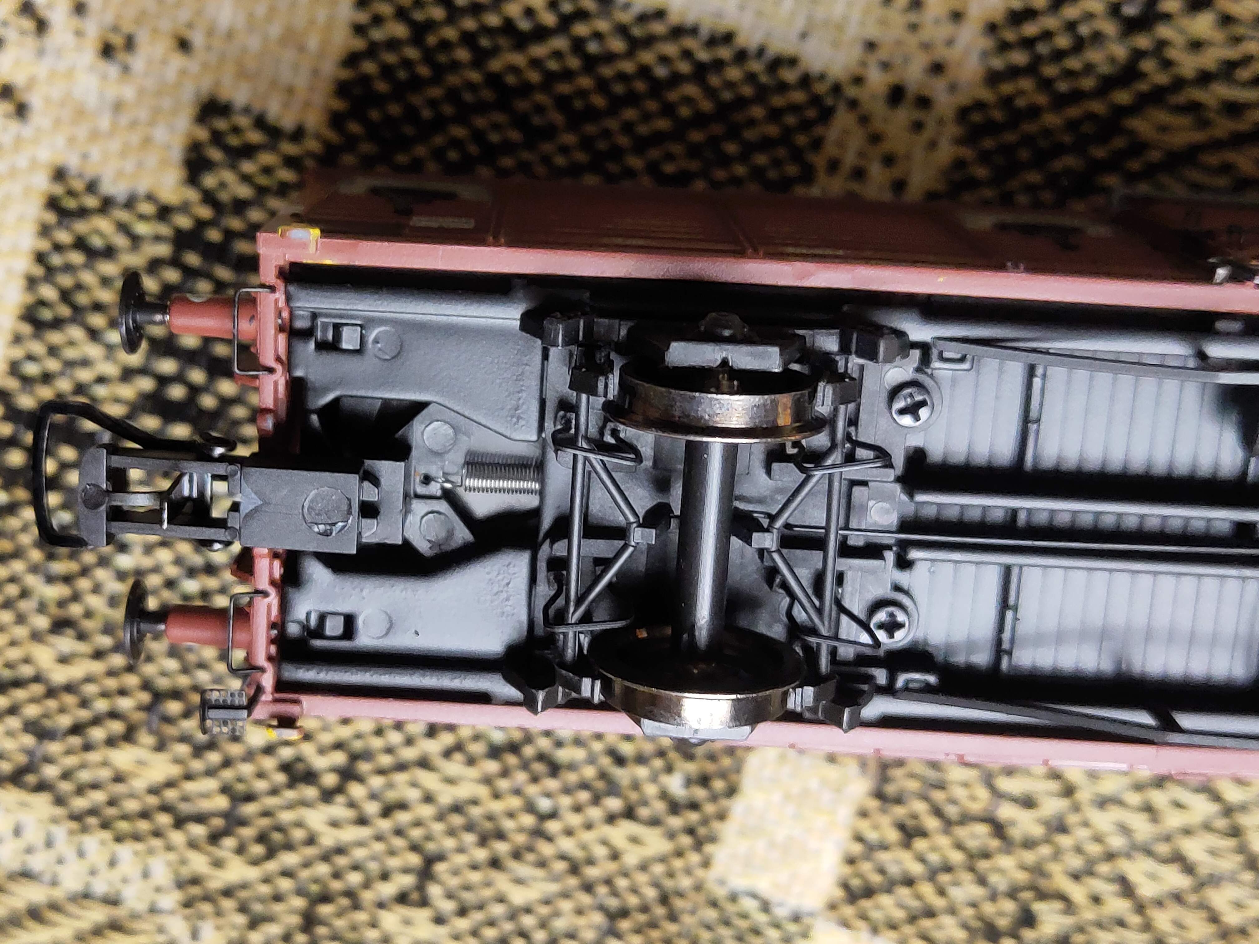 Как вам пёстрые узоры на моей скатёрке? Не перебор? К слову, рама вагона из металла, что, как заявлено, очень положительно влияет на характеристики поката. Забегая вперёд, могу отметить, что движение по рельсам у вагонов образцовое
