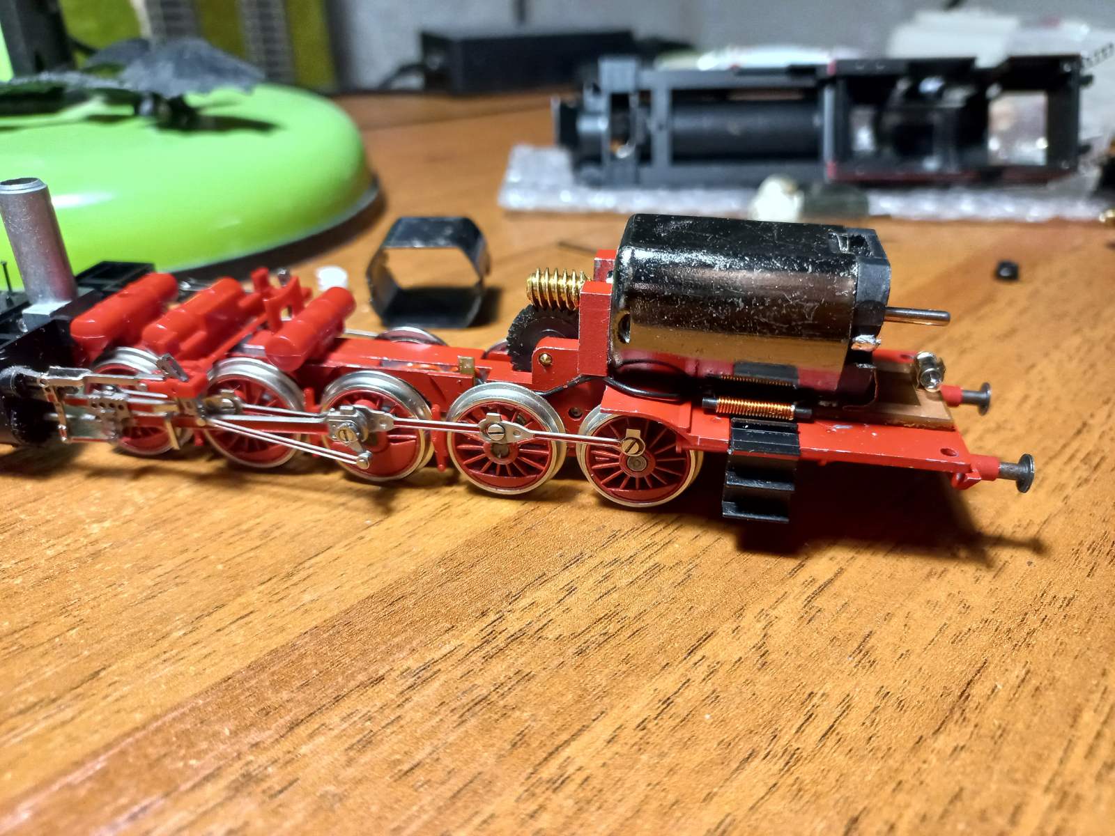Це логічне припущення, такі випадки були. Наприклад, перестарався зі змазкою Е42 "Піко", що призвело до горіння одного з моторів. Але... такий самий двигун, взятий з іншого 95-го паротяга, теж намагається себе спалити. Навіть працюючи окремо, дістаний з лока. На невеликій напрузі (скажімо, до середини ручки пульта) все норм, далі - вогняне шоу. Процитую також іноземного власника аналогічної моделі: "Локомотив їхав, але двигун сильно нагрівався. Тому я почистив його. Успіх був незначним, мотор все одно сильно грівся. Вимірювання струму споживання показало 800 мА при напрузі 10 В. Розібрав двигун та поміряв обмотки - 6 Ом.". На жаль, немає інструментів, щоб провести аналогічні вимірювання. А от результати чистки були такі самі, тобто майже ніяких. Ще було непросто розібрати мотор, бо маховик та черв сидять надто міцно. На першому (вщент згорівшому) двигуні ледве їх зняв, погнувши з'йомника. Другий двигун не став розбирати, чекає кваліфікованого огляду нашого колеги для з'ясування причин загоряння.