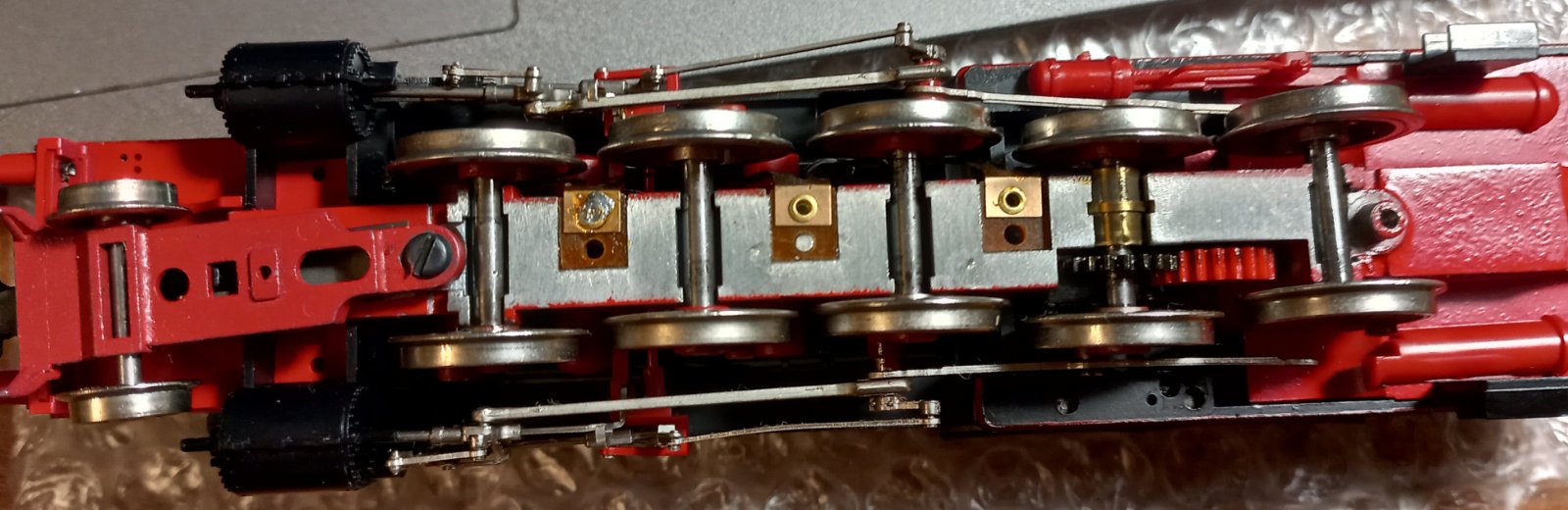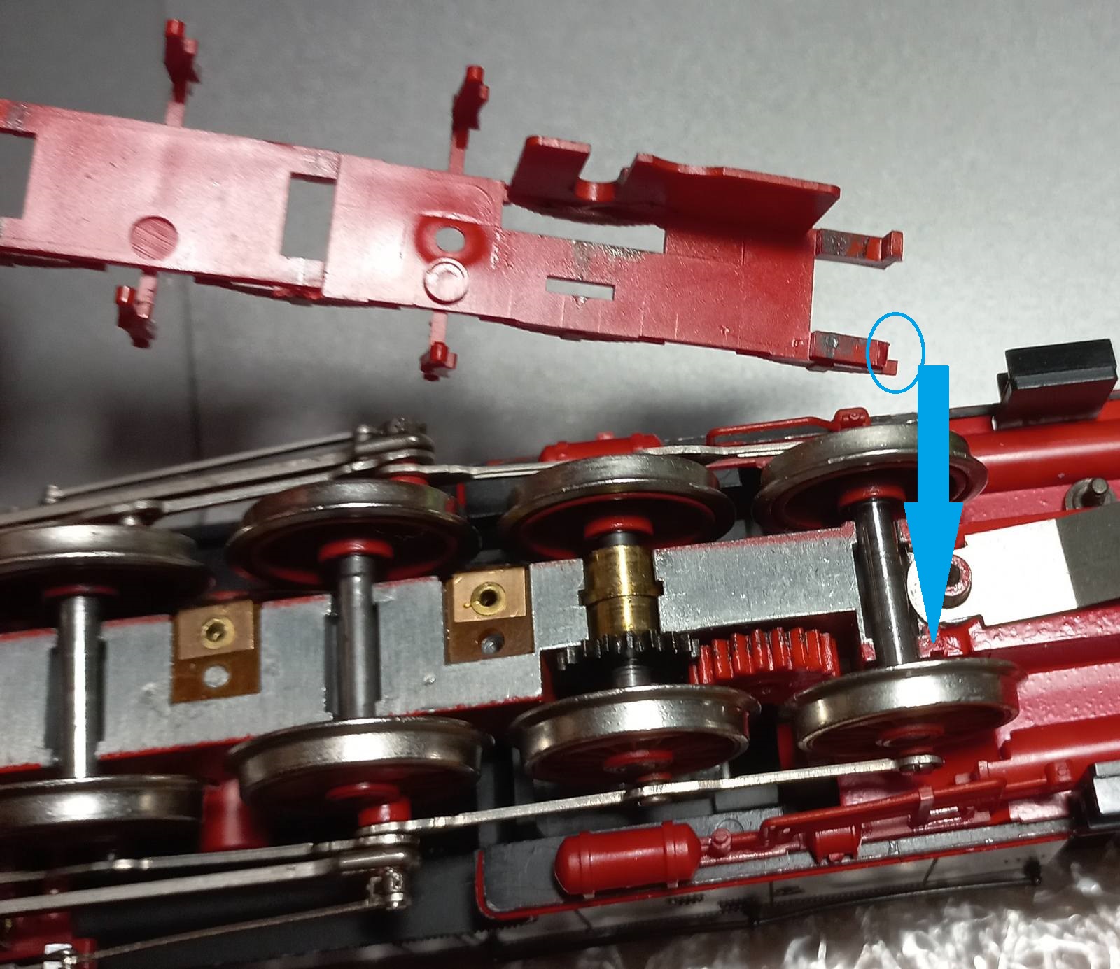 Ви подумали, що це все? Не зовсім) Під час обкатки виявив, що 5-та колісна пара перекашується у кривих, призводить до нерівномірного ходу, сходів на стрілках і тому подібних капостей. Причина у конструкції прижимної кришки на дні паротяга. Вона фіксується двома гвинтами, а також по краях має по дві защіпки-фіксатори. І остання колпара утримувалась тільки за рахунок защіпок, бо найближчий гвинт знаходився по центру кришки.