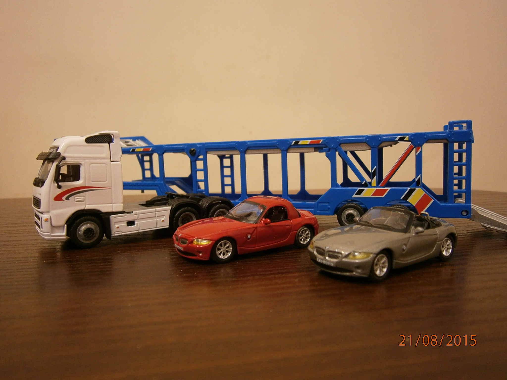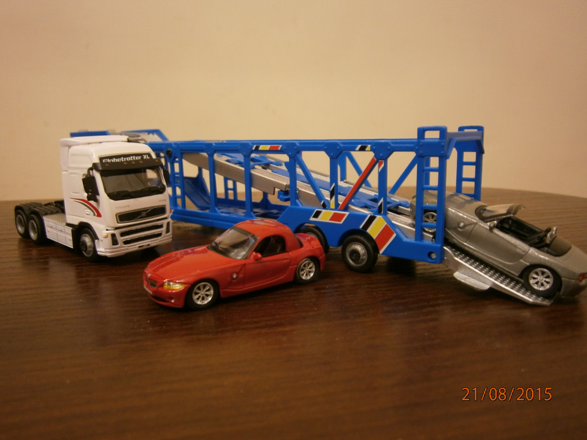 Досить симпатичний набір який мені дуже подобаеться. Правда прицеп виглядає аж за надто іграшковим (мабуть треба перефарбувати), зато в ньому рухома платформа для заїзду машин