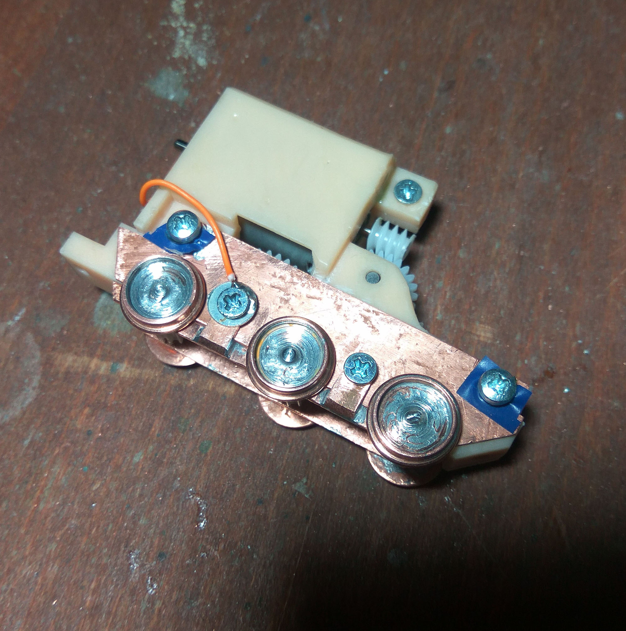 можно вытачивать и крайне маленькие колесики. Это из цельного куска 2 мм толщиной (в H0e надо 2,2мм, но попробую обойтись как есть). Внутрь на эпоксидный клей (циакриновый от температуры при обточке может разложиться) вклеена трубочка для поплавков. Она и выполняет роль изолятора. Довольно приличный вызов - просверлить отверстие точно по центру обода, и не сломать сверло в 2 мм толще. Потом там нарезана резьба 1,2 мм под пальцы. Поскольку у меня дышла получаются под напряжением, подумываю, а не снимать ли ток прямо с кронштейнов на которые они подвешиваются на корпус. Тогда можно было б обойтись без щеток, но контакт может быть прерывистым. Надо пробовать, короче