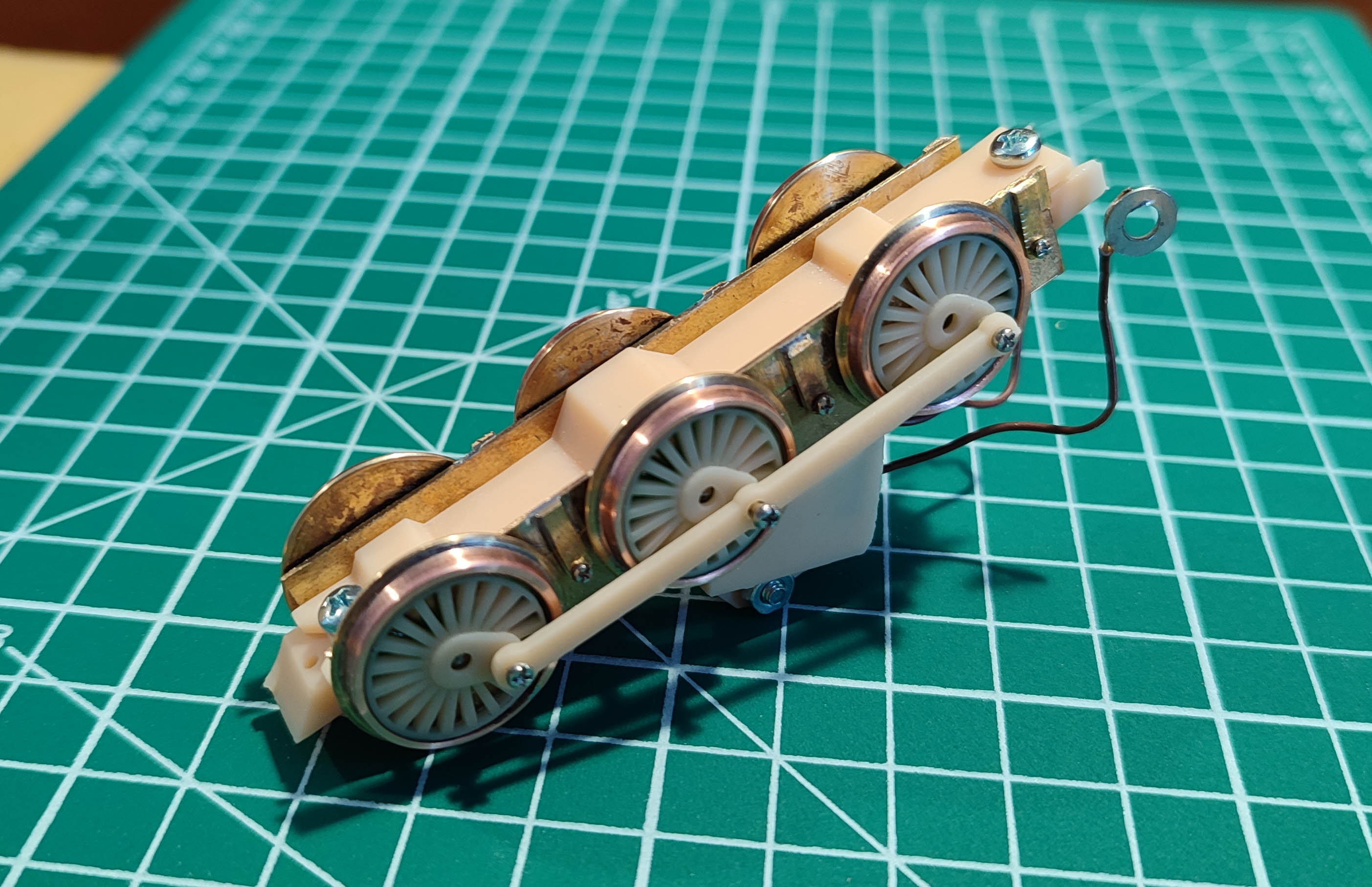 Имеют преимущество, что не нужно щеток на обод и нет сопротивления вращению. Недостататок, что нужно изолированную жесткую трубку между полуосями, тяжело напресовать колеса без восьмерки, и смазку токопроводящую. При этом колеса будут непрозрачные, что очень заметно будет на пассажирских паровозах. Для колес я использую 2 мм стержни, на которых нарезаю резьбу и вкручиваю в отверстие в металлический кругляшок чуть больше полного диаметра колеса. Затем еще снаружи желательно закрутить типа гайки. Я использую для большинства резьбових соединений Brass insert nut (гуглится) разного размера. Потом это тщательно пропаивается. Дальше я зажимаю ось с кругляшком в патрон (у меня есть микростаночек для точки дерева он когда то дешево стоил, но наверно и дрель подойдет) и обтачиваю отрезным кругом гравера (нужно очки и мастерская какая то, бо жесткой пыли и частиц металла летит знатно). Если у меня колпары под боковинами рамы и лень морочится, то просто из цельного куска вытачиваю вначале круг по полному диаметру, а потом выбираю поверхность катания по нормам НЕМа