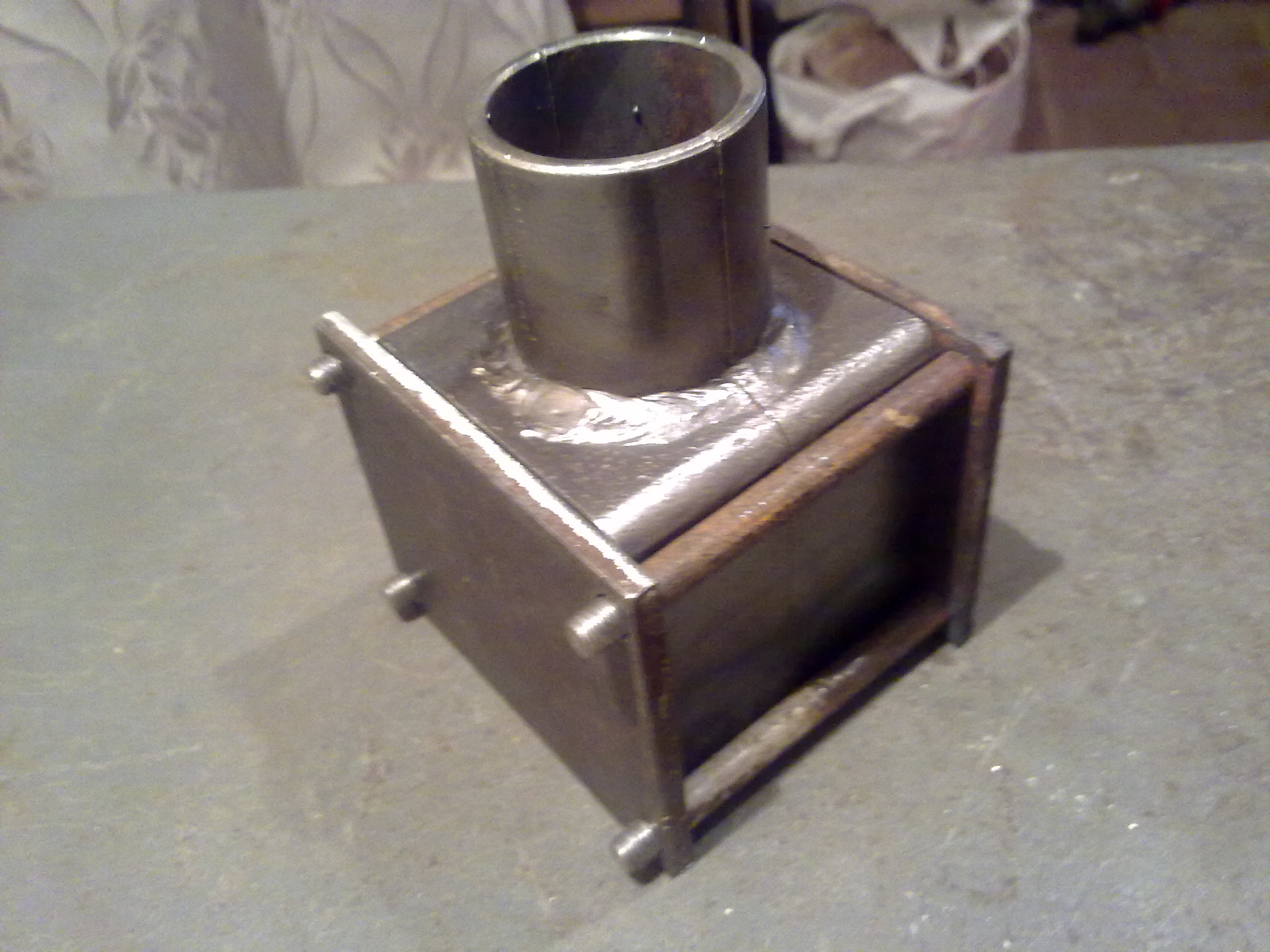 В основе конструкции квадратная труба 80Х80 мм и горловина Д40 мм. После сварки корпус с горловиной были разрезаны ножовкой (с перепугу болгаркой не решился) и к половинкам приварены направляющие штифты. Штифты выточены по принципу дверных петель.