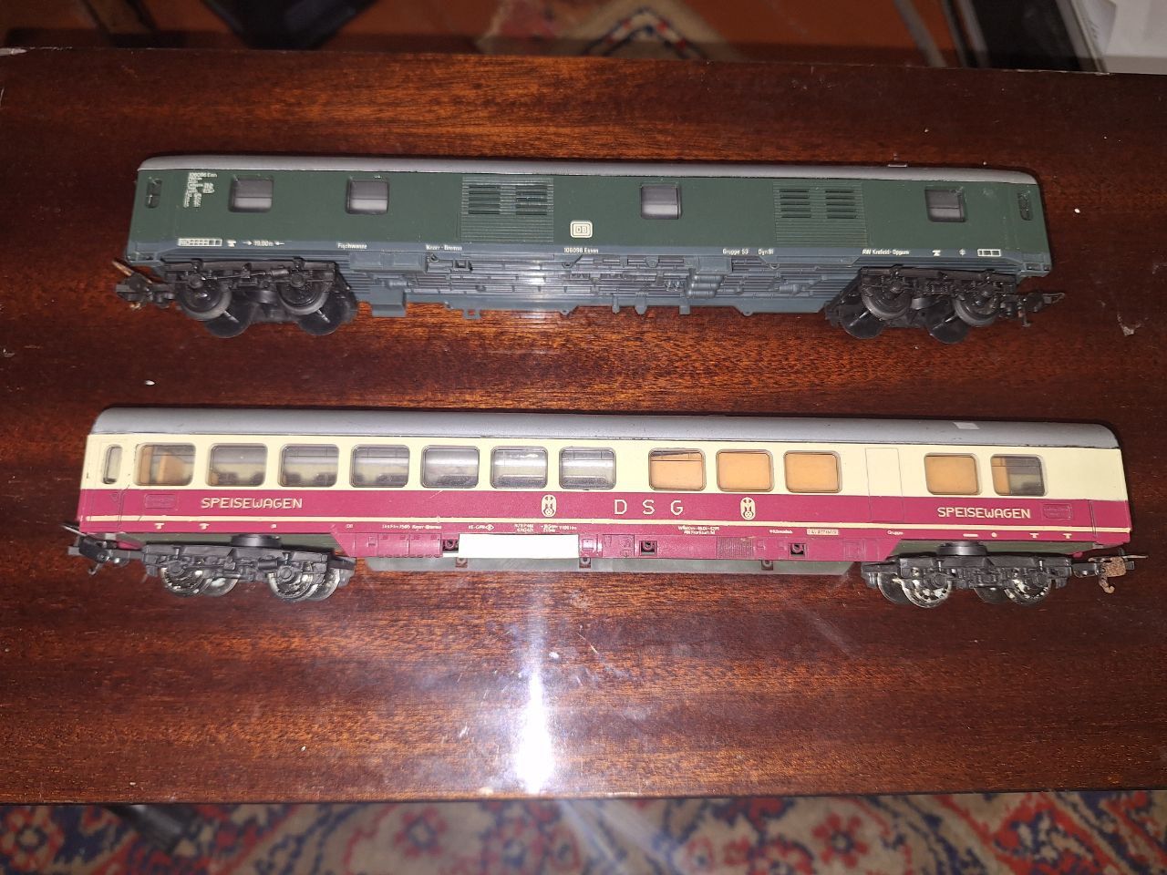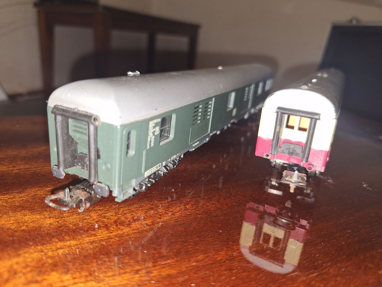 Привіт, може вагони комусь знадобляться. Поштовий мені нуднуватий, але цілий, буфери цілі, ресторан без буферів і підніжок, але з салоном і металевими колпарами. Не хочу лишати, бо рест належить DSG, що мені не підходить, я збираю ранні 80ті, а DSG існувала до 1971. Краще вже знайду мітропу 80х для поїзда DR.