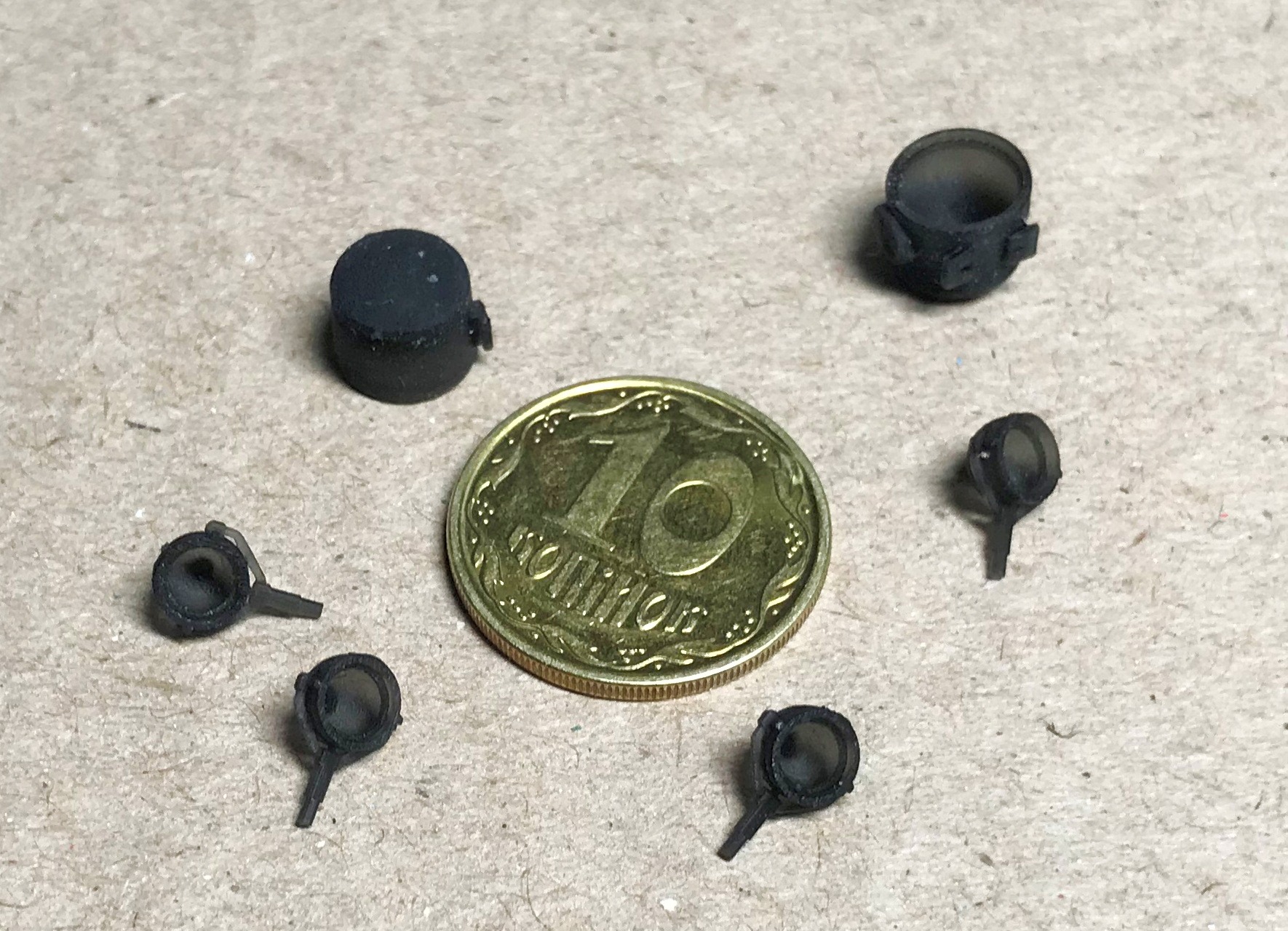 1. Прожектор та буферні ліхтарі для локомотивів (переважно паровозів) 40-60х років. Буде комплект – один прожектор і чотири буферні ліхтарі – два для паровоза та два – для тендеру. У корпусах є отвори для тонкого дроту при створенні ліхтарів, що світяться. Скло, на жаль, поки що замовити не вдалося, доведеться робити самим. Кількість обмежена, поки що лише пробна партія. Пластик, сказали, міцний, отримаю – перевірю. Раніше замовляв з такого інші деталі, то вони не такі крихкі, як зі звичайного фотополімеру. Отже, якщо когось зацікавить, пишіть у особисті повідомлення.