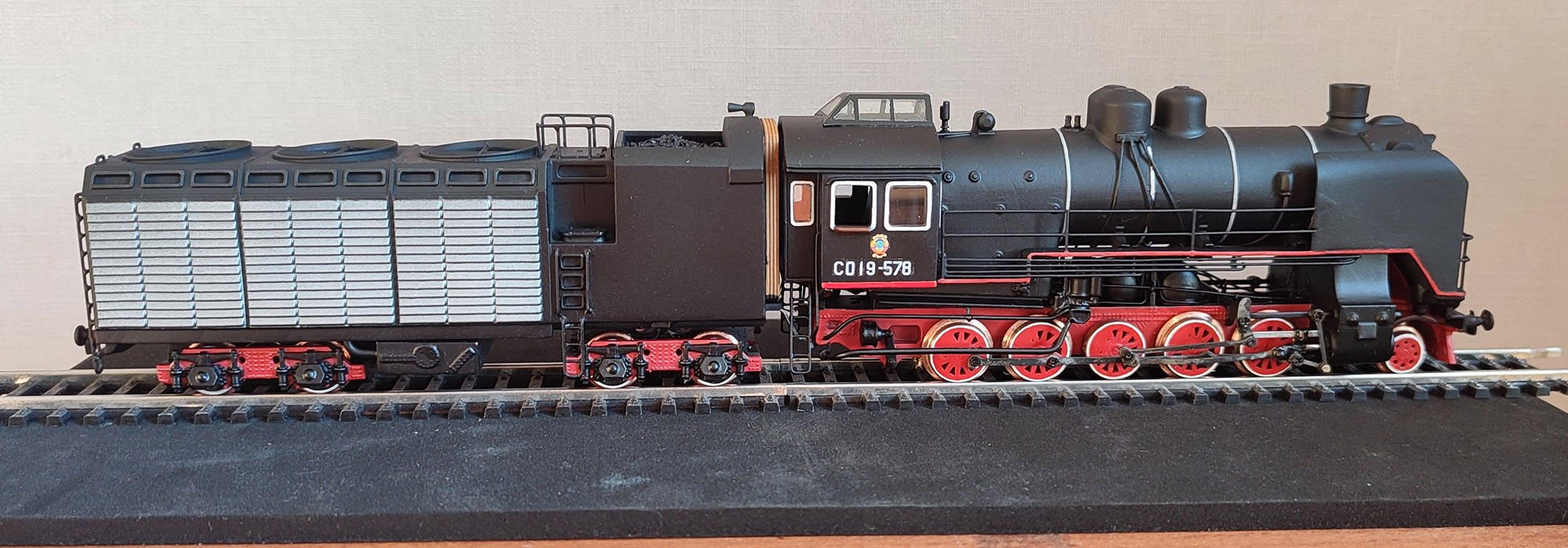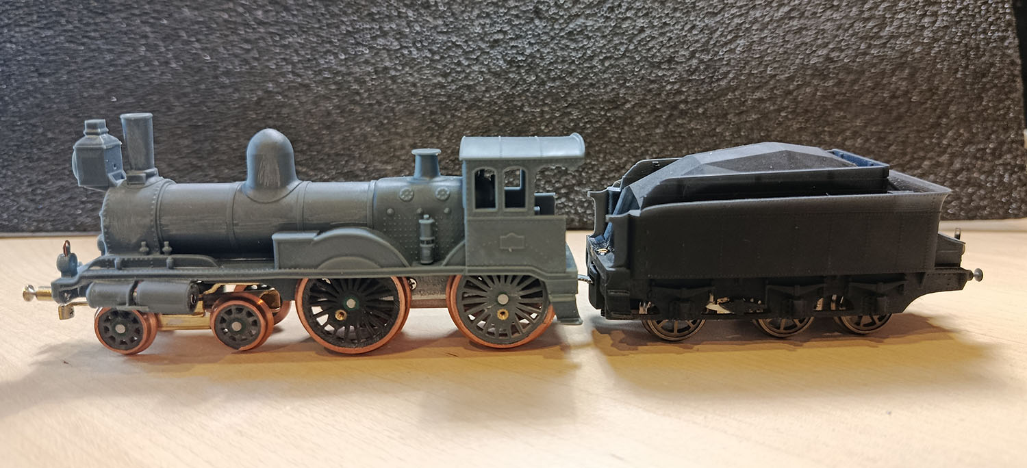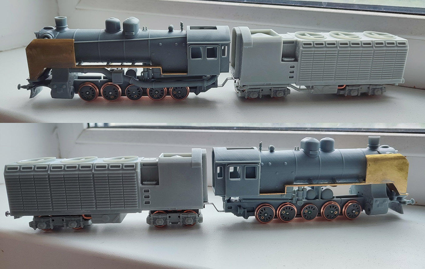 Одной из первых моделей что я делал был Су. С наработкой некоторого опыта стало понятно, что его сделать можно было гораздо лучше, чем я и занялся. В частности исправлен масштаб, прозрачные колеса, тендер без поворотных тележек с 1м нормальным пятиполюсным двигателем и адекватной скоростью (конструктивно почти такой же как далал на Эм и Фите), и сцепка с тендером крепится к поводку поддерживающей колпары, что должно улучшить прохождение кривых. Не обошлось без мелкой ошибки и высота над рельсами выше на 2мм, что впрочем не так заметно. В этот раз запланировано освещение и дополнительный токосьем в паровозе