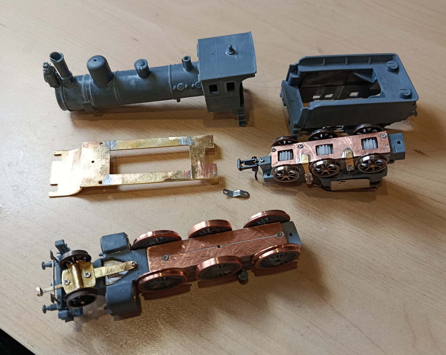 Тендер я все таки переделал под 2 двигателя в тележках, минимально модифицировав уже изготовленные. Они правда вдвое более высокооборотные и придется что то делать с этим, что б товарный паровоз не носился как пассажирский, но зато значительно меньше шума. Впервые попробовал использовать в паровозе китайские бронзовые втулки на оси, пока вроде без особых нареканий, правда придется что то сделать, что б прижимная пластина снизу одинаково плотно прилегала ко всем втулкам, без зазоров