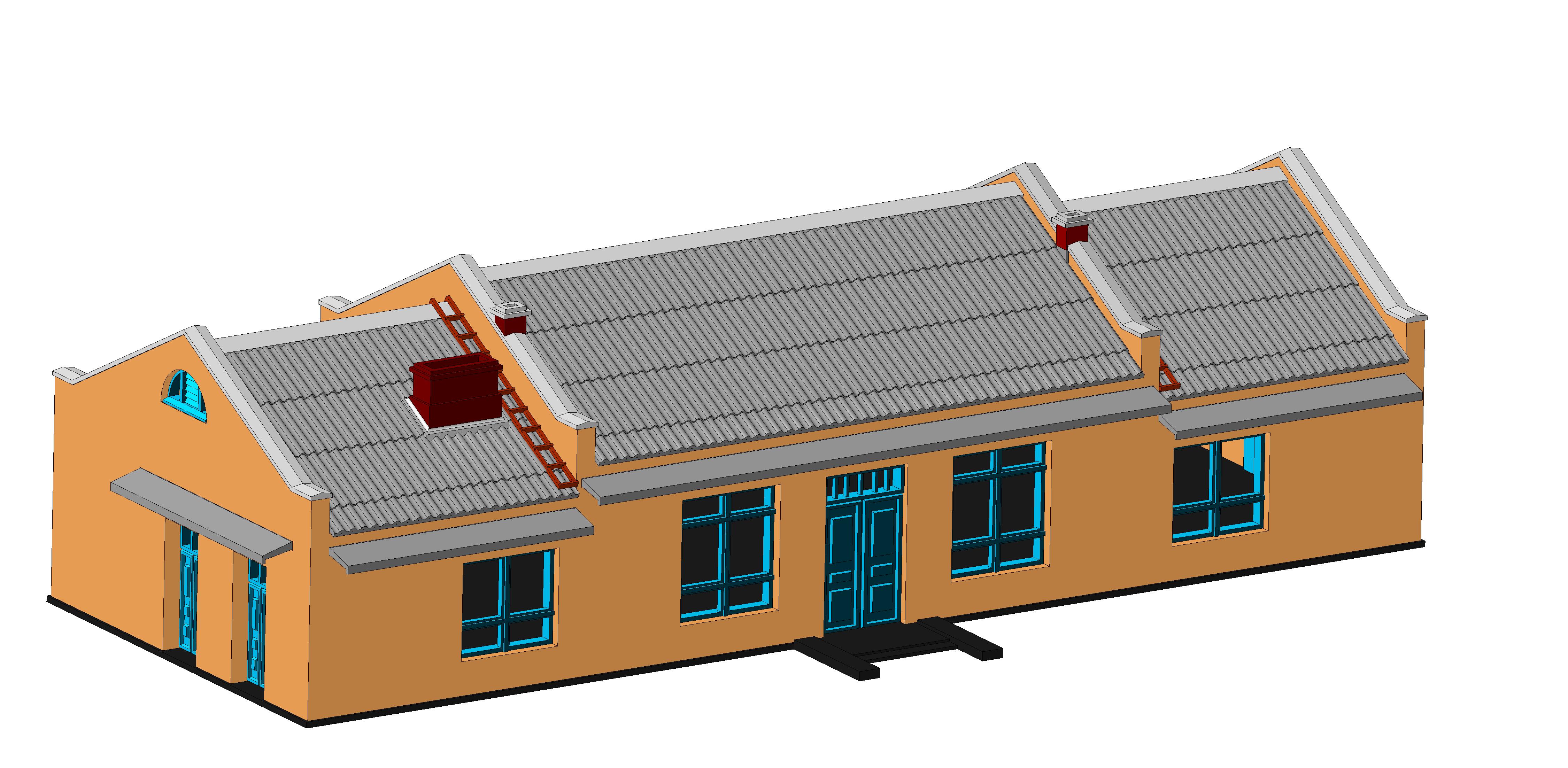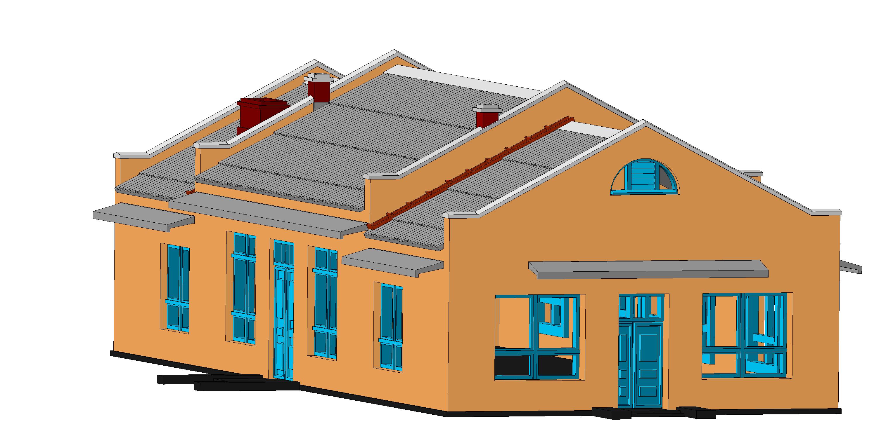 Здание построено из ординарного или полуторного белого кирпича, перекрытие крыши гидроизолировано рубероидам. Двери и вентиляционные решетки выполнены из металла и покрыты нитроэмалью. Размеры:52,95ммХ49,70ммХ30,50мм.