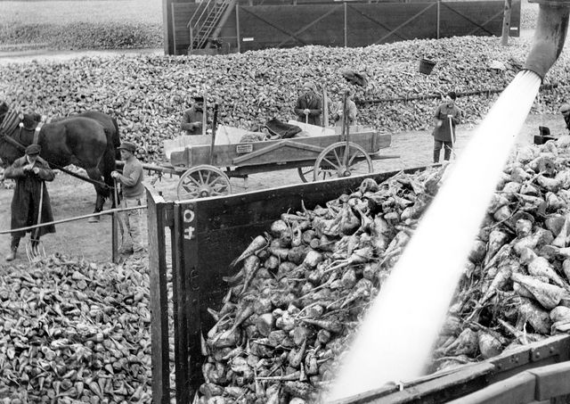 Разгрузка и одновременно промывка сахарной свеклы сильной струей воды,1940й год.