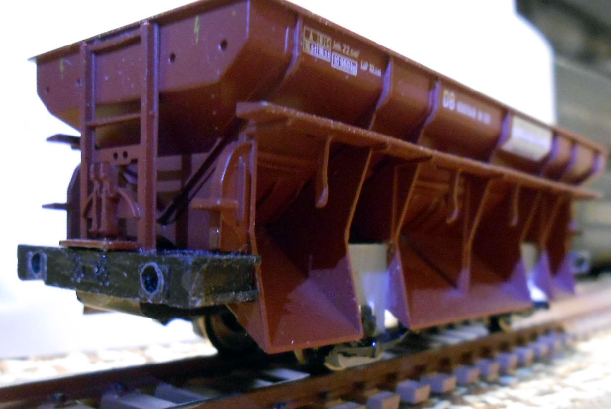 вариант этого вагона.На фото выше он слева. Зарезал раму вагона. Бункера дополнительно догружаю свинцом,предварительно обвернув их