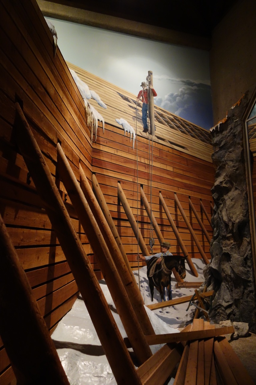 А сложностей хватало, особенно когда стройка достигла горных районов Сьерра-Невады. Об этом рассказывает множество фотографий и диорамы. В такие срубы, например, заключали железнодорожное полотно, чтобы избежать засыпания снегом.