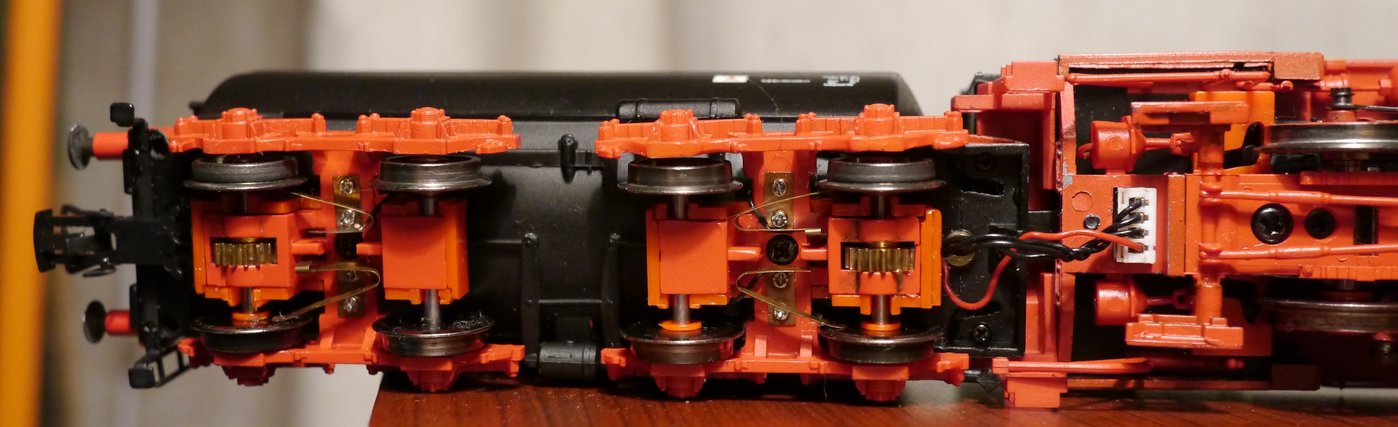 Ходовая часть: Как видите, привод в тендере. На две крайние оси. Телеги тендера жестко закреплены в раме. Шестерни на осях колпар - латунь, промежуточные - пластик, а червяки тоже металлические. Я так подозреваю, что такое сочетание делает трансмиссию менее шумной, чем полностью металлическая?