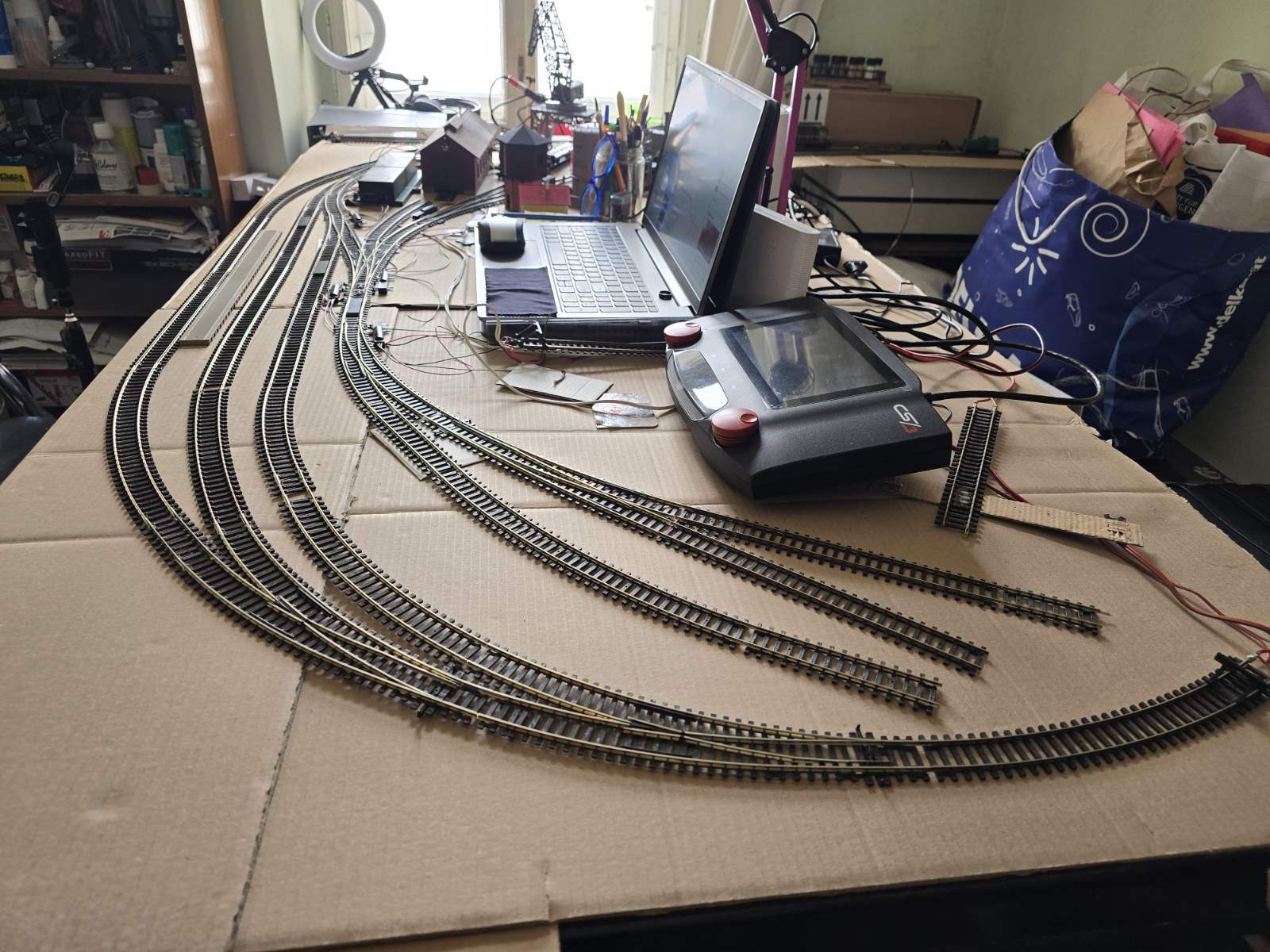 Вже в котре впевнююсь в тому, що залізниця, чи то справжня, чи то як моя на столі - це окремий живий організм, який живе своїм життям. В мене все починалось з кількох розгалуджень для виконання мінімальних маневрових робіт. Головна задача, це періодично прогнати локомотиви, щоб не закисали. Але не тут то було, залізниця почала відвойовувати простір і розширятись, я тому не дуже й сперечався. Отже процес невпинно йде, план розвитку залізниці вже мінявся і доповнювався разів шість. На сьогодні залізниця має таку рельсову схему: