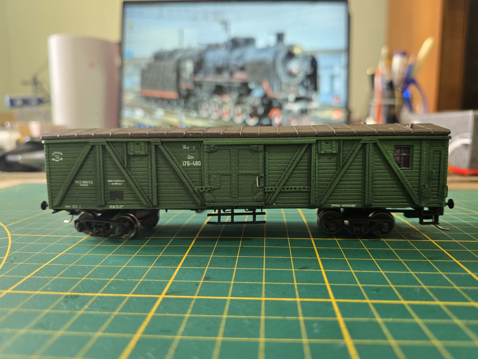 Хто відслідковує творчість Юрія Олександровича, мабудь помітив, що 06 серпня, я відвідував Храм Моделізьми - дійсно святе місце. Як завжди, час промайнув миттєво. Багато вражень, живе спілкування, а головне - атмосфера людей об"єднаних однією пристрастю. І знову зішлюсь на шанувальників творчості ЮрСанича, в своєму розділі "Будуємо вагони вітчизняної залізниці" від 22 травня ( День Св.Миколая) дуже знаково, на моє прохання почав будувати збірно-роздавальний вагон з дверима, що відкриваються та припискою до Дон.жд. Робота Майстра вражала і на відстані, але коли взяв до рук, то надихнули спогади, згадалось дитинство і ті часи, коли проводив на станції біля подібних вагонів. Дуже вдячний за таку індивідуальну шикарну роботу. Ось він, герой на моєму столі: