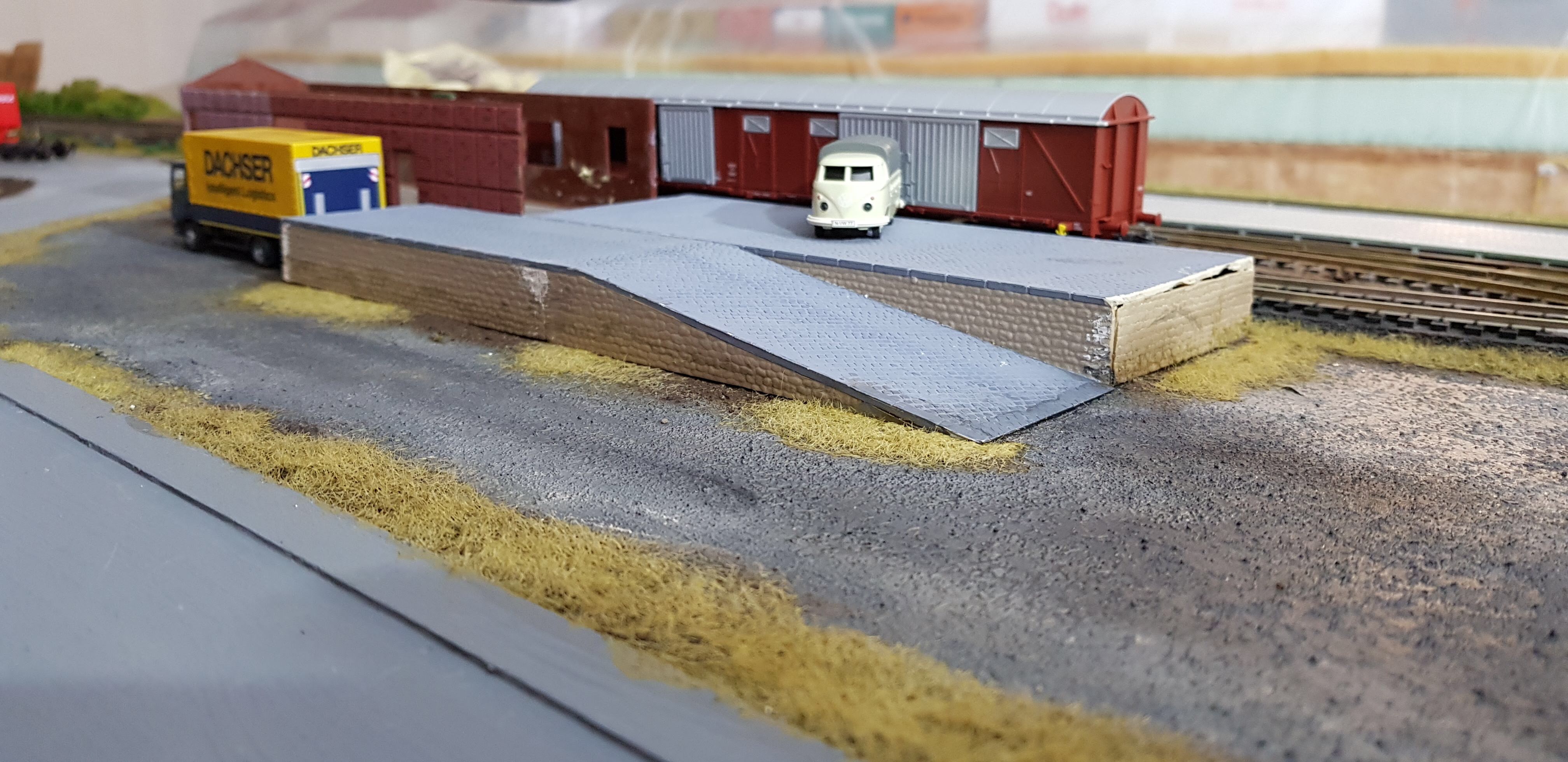 - наконец решил какая будет путевая схема и реализовал ее. Под склад и рампу становится 2 вагона, под кран один. Путь под краном ниже, чем основной, т.к. Нагрузка на него ниже и можно сделать меньшую призму. Под складом тоже так можно, но было лень переделывать.