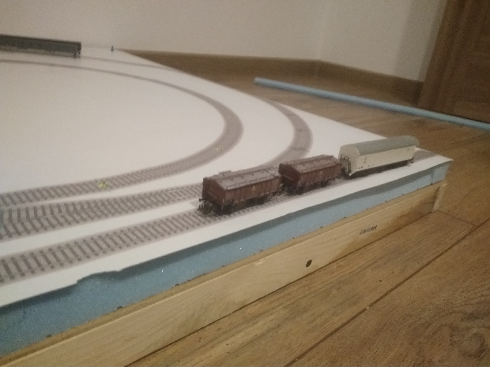 Тепер щодо бортиків - у мене на старому макеті вони зі шматка старої шафи, на фотках є. І вони надійно захищають рухомий склад від падіння з висоти внаслідок випадкового удару, у мене все таки дитина мала, тут якщо навіть макет лежить на підлозі, висота до головки рельса буде 5-6см, при чому по краях колії місцями ідуть по самій кромці. Також на них зручно монтувати всякі роз"єми, органи управління, я навіть подумую чи не впихнути на макет вольтметр/амперметр