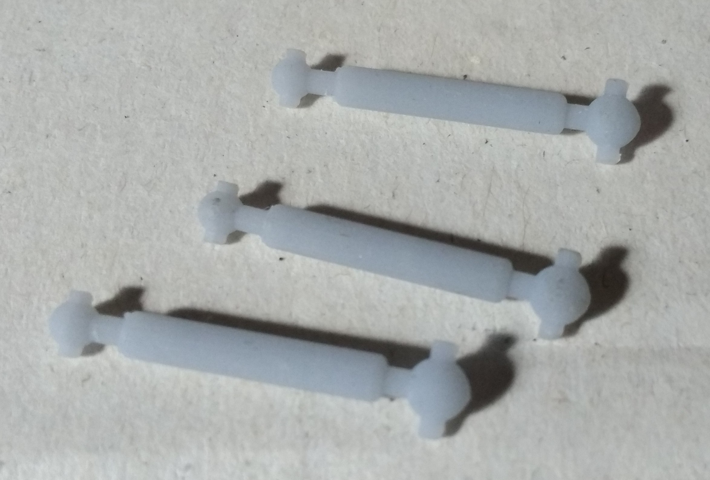 Две части (диаметр головок 3мм) вставляются одна в другую. Склеивается суперклеем. Обрезая длинную часть, получаем кардан нужной длины. Это у меня идея возникла по поводу замены в Бр-120 штатного мотора. А там размеры мотора немного другие. В принципе, с набором шестерен от Бр-120 (набор разработан), можно делать и свои ходовки. Но это уже следующий этап...