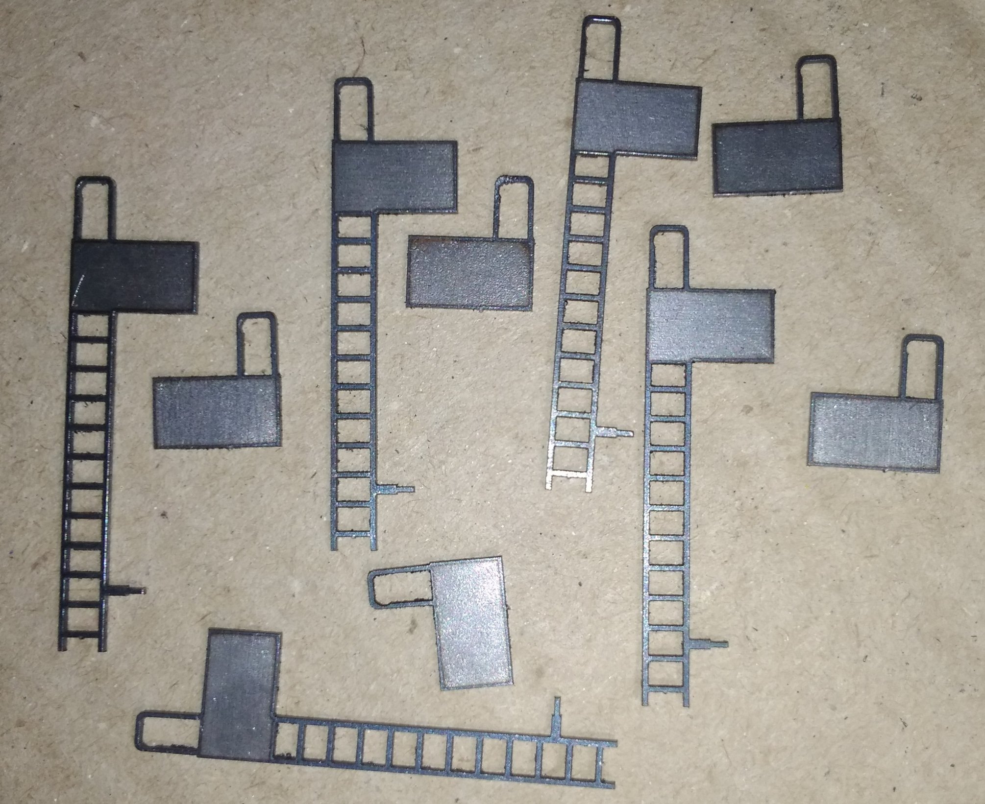 Удалось сделать немного деталей лазерной резкой. Пока выкладваю так сказать, с пылу- с жару. Будут ещё обрабатываться, химически черниться (которые будут черные) и краситься.