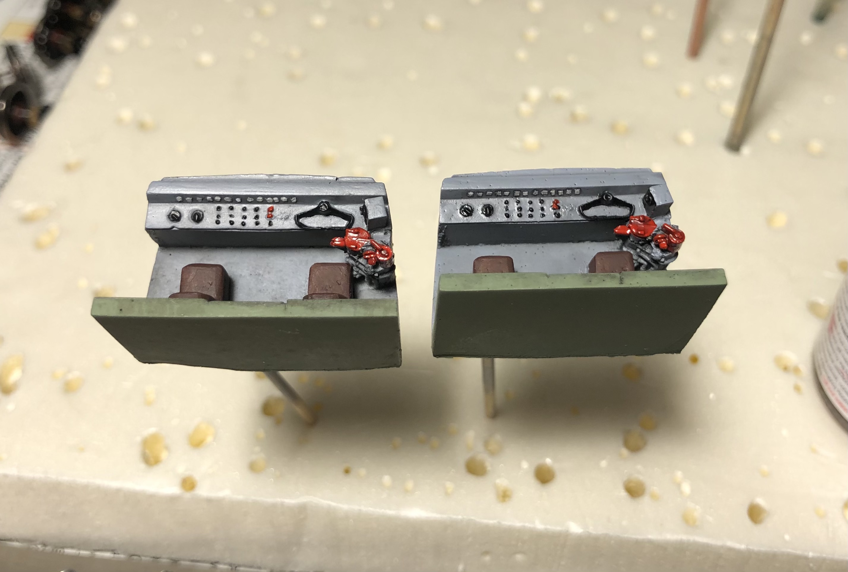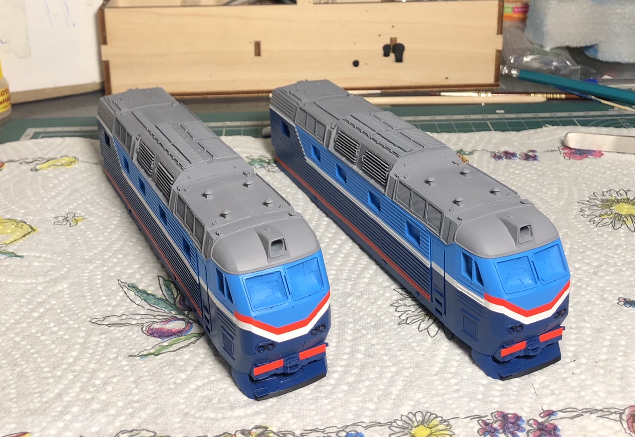 Всем привет! На данный момент загрунтовал металлические рамы, загрунтовал и покрасил боковины имитаций экипажной части, а так же кабины машинистов. Нанес так же смывку, осталось покрыть лаком..
