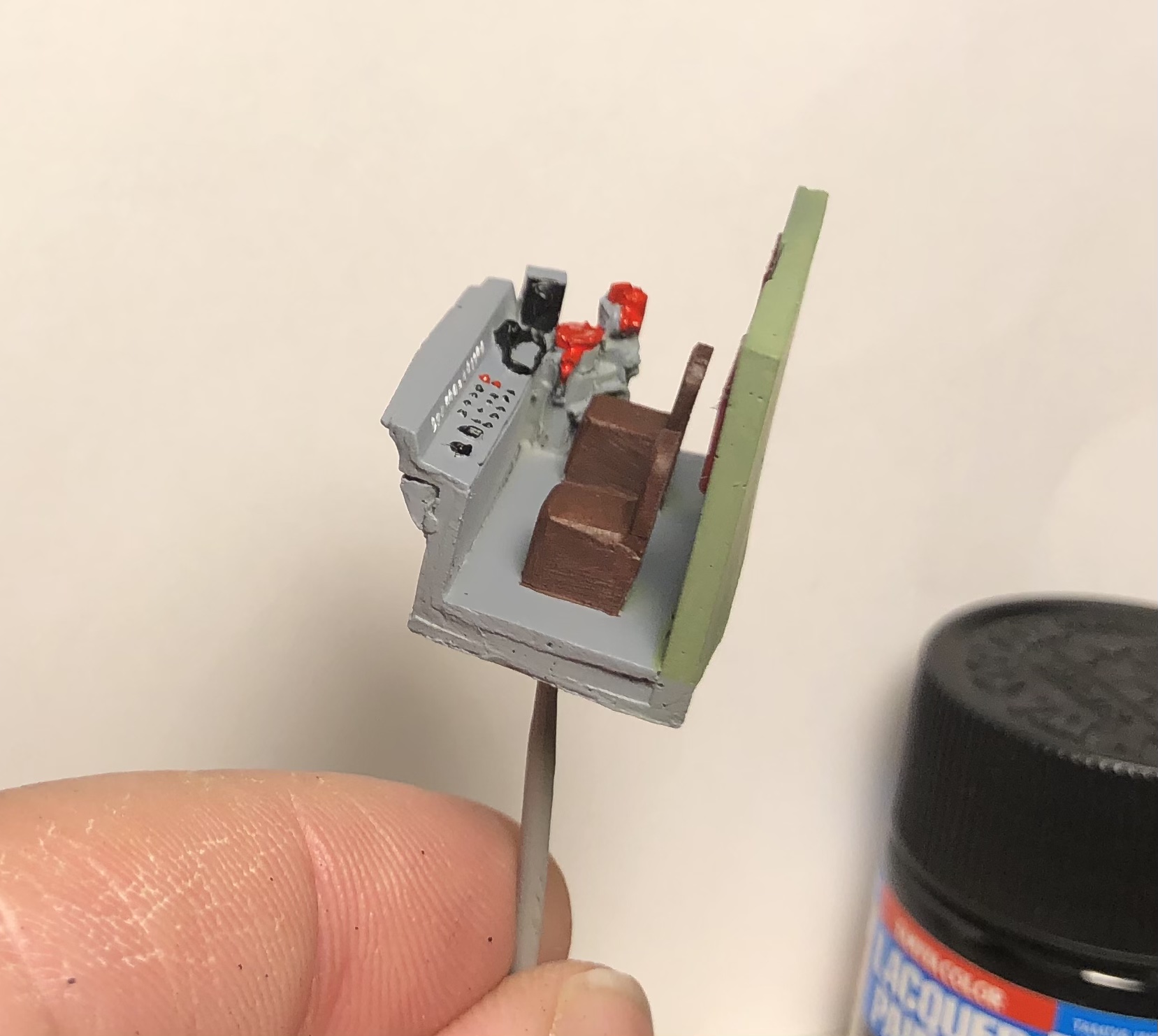 Припаял к светодиодам провода, на буферные фонари сделал шинки из металлических пластинок от фототравления, как у Сергея. В прожектор подошел отражатель от фар авто от фирмы Elf. Вырезал маски птичек на морды электровоза.. искупал оставшуюся мелочевку и кузова в фэйри и загрунтовал. Кузова пошли небольшой шагренью.., грунт использовал мотип, предварительно слив его с балона, грунтовал аэрографом, но что то пошло не так... пришлось подшкурить и завтра загрунтую их повторно из баллона